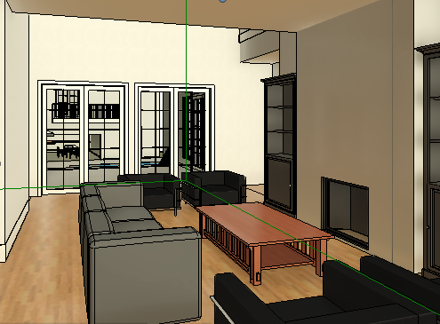 wood floors upholstered furniture light color paneled walls and mantel add windows above doors add rug add books to shelves