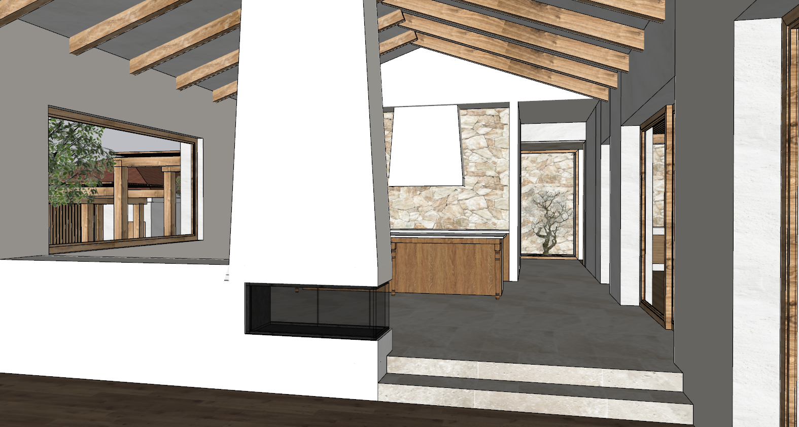make the materials more realistic add furniture to the dining area between fireplace and open kitchen and sofas in the living area on this side of the fireplace limewash walls stone feature walls feauture interior garden with an olive tree