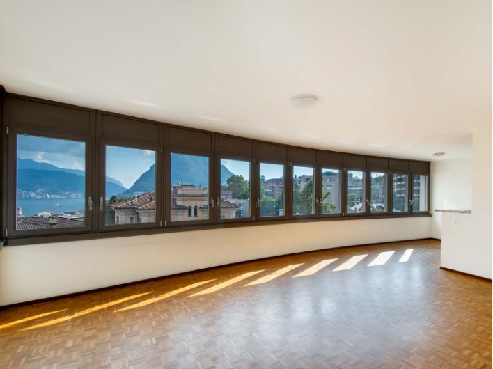 windows frame white and new floor add furniture and add kitchen far away in the angle on the right