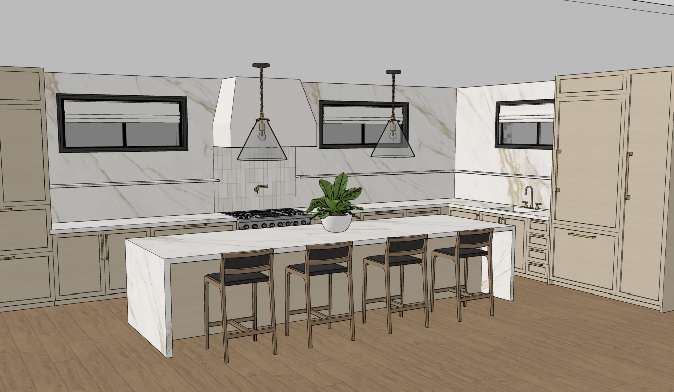render this kitchen as a photorealistic interior do not change any colors materials finishes or textures under any circumstance keep every detail exactly as shown the warm light wood flooring creamy beige cabinetry white marble with gold and taupe veining on the countertops and walls brass hardware and fixtures black window frames neutral walls and the dark wood and black bar stools maintain the exact layout proportions lighting fixtures and camera angle add recessed pot lights in the ceiling and introduce soft natural daylight through the windows keep the exterior view blurred with subtle sky and greenery only enhance realism by improving lighting reflections shadows and surface depth while keeping all existing colors and materials exactly the same make the lighting just natural