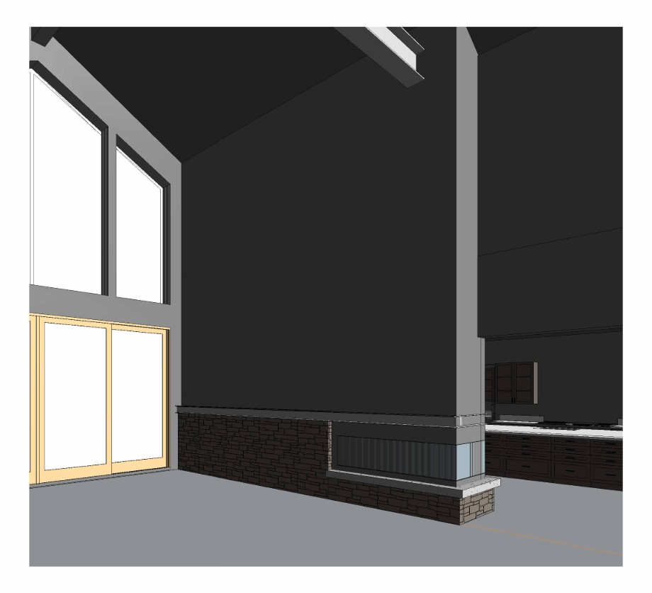 can you render this show show a black metal panel above the fire place and the steel members as black this is for a luxury mountain home in driggs idaho so the doors and windows should be black storefront looking out to a wintery scene the stone should be a gray ish rustic ledgestone and the floors should be nice wood plank