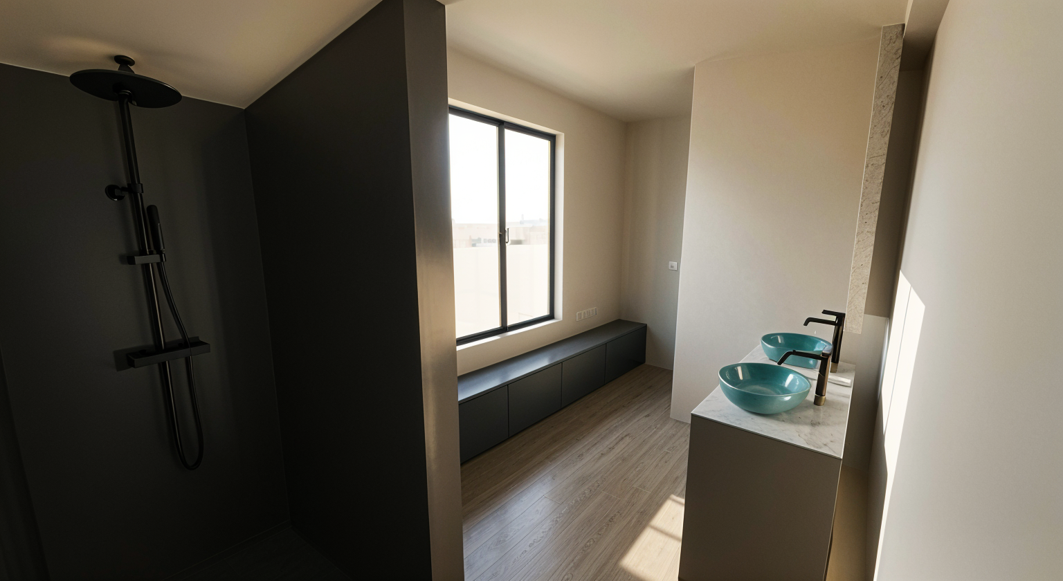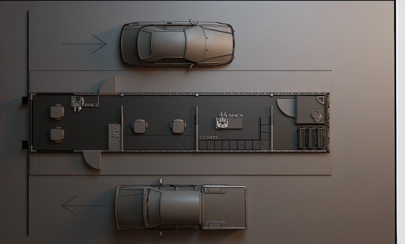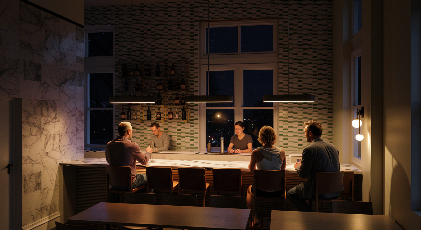 keep everything in the render as it appears but make it a nighttime scene with two bartenders working behind the bar and three people sitting in the bar stools there should not be any recessed lighting