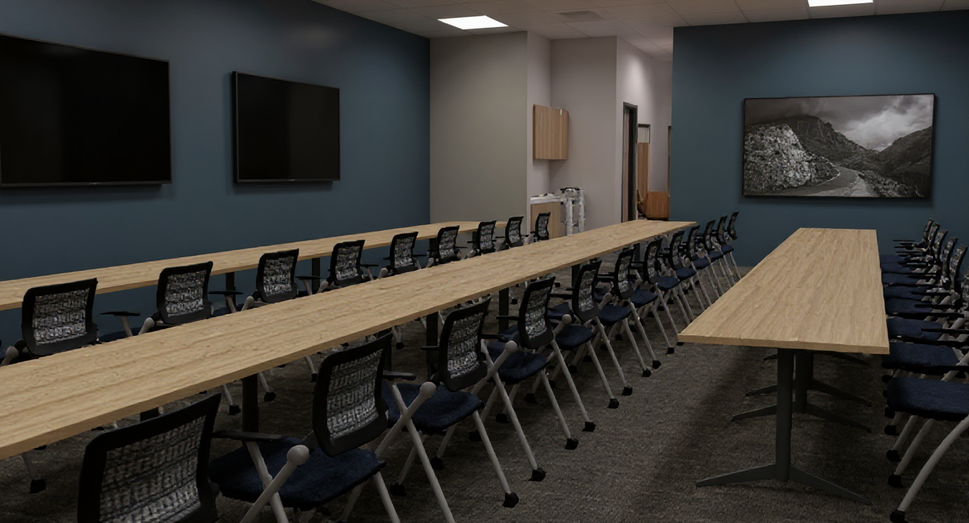 render image keeping all colors and finishes and architecture the same make photo realistic make ceiling 2x4 office grid with lights do not change architecture