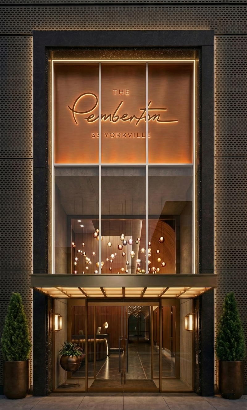 create a high end photorealistic architectural rendering using the provided sketchup model as the base geometry strictly preserve all proportions materials facade divisions and architectural elements no redesign or reinterpretation scene atmosphere cinematic quality time blue hour dusk transitioning into night sky deep blue gradient with subtle ambient glow balance natural and artificial light for a cinematic high end look slight atmospheric depth very subtle haze for realism no overexposure no crushed blacks lighting portfolio level critical all lighting must be warm white 3000k and fully consistent quality of light fully diffused indirect illumination no visible led strips or harsh lines smooth gradients and realistic falloff soft transitions between light and shadow light behavior light should wash surfaces not outline them subtle glow around frames and curtain wall no sharp edges realistic bounce light on adjacent materials canopy lighting light passes through the bronze lattice visible soft patterned projection below very refined not harsh creates depth and layered shadow logo soft halo backlighting elegant even glow no hotspots sconces soft downward wash gentle gradient fading into the wall material realism ultra important all materials must feel physically accurate and tactile graphite perforated panels sharp crisp perforations subtle reflectivity not flat not glossy micro shadowing within perforations crystal black stone polished with controlled reflections slight natural variation not perfect mirror black terrazzo visible fine white speckles slight depth and texture bronze canopy sconces handles brushed metallic finish warm reflections from lighting subtle imperfections avoid flat cgi look glass clean and slightly reflective show faint city environment reflections maintain interior visibility no mirror effect realism details this makes it portfolio level add subtle imperfections very light smudges or fingerprints on glass slight variation in reflections micro surface irregularities ground plane clean but realistic sidewalk slight roughness and reflectivity variation add very subtle context soft blurred urban reflections no distractions no people or only extremely subtle silhouettes if any camera composition eye level perfectly centered symmetrical composition slight wide angle lens 24 35mm strong focus on entrance canopy and illuminated logo depth slight depth of field very subtle mostly sharp strong foreground to background clarity color post processing natural color balance no oversaturation slight cinematic contrast warm lights vs cool environment contrast soft highlight bloom very subtle no artificial filters or stylization final output quality ultra high resolution sharp but natural no over sharpening clean edges no noise no artifacts final strict instruction enhance only realism lighting quality and material definition do not change geometry layout facade patterns or architectural elements if lighting materials or reflections appear artificial or flat regenerate until achieving high end architectural visualization quality suitable for a professional portfolio