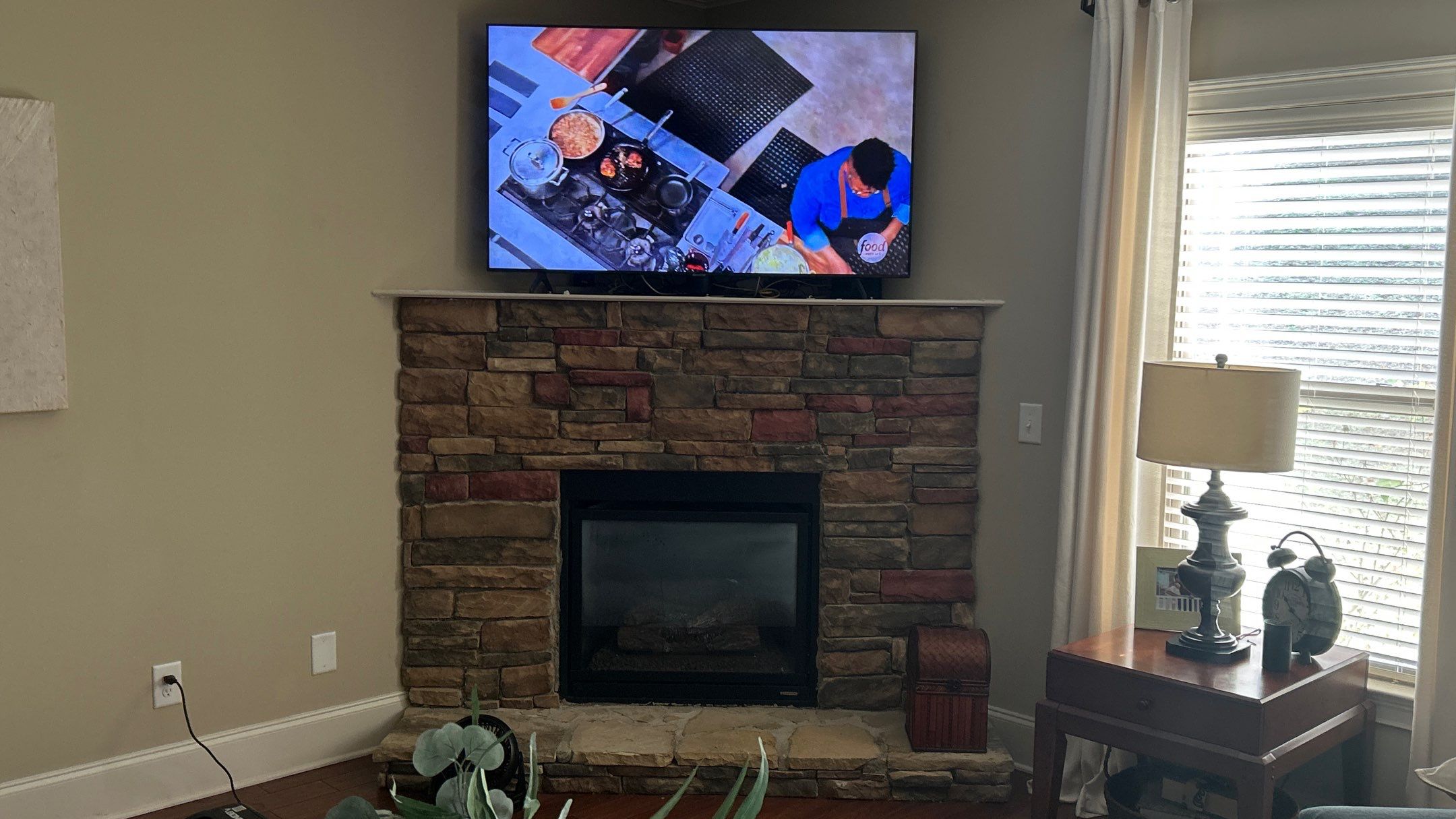 add a thicker white mantle below the tv and white pilsaters over the stack stone to the left and right of the firebox