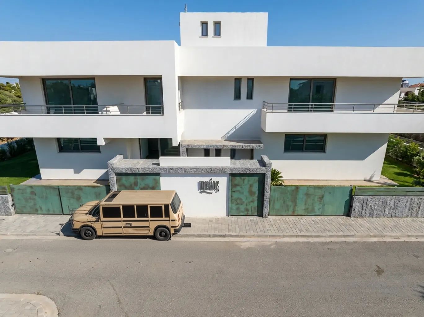 modern white villa with a minimalist design featuring sharp lines and a flat roof the building is set against a brilliant blue sky enhancing its bright clean appearance incorporate large glass windows with sleek silver frames adding a touch of elegance the surrounding wall is built of textured gray stone and has green oxidized metal gates that offer an artistic contrast a tan colored van is parked on the stone paved street in front contributing to the urban chic atmosphere lush green grass and subtle well manicured shrubs frame the villa creating a serene and upscale environment the overall atmosphere is modern sophisticated and tranquil