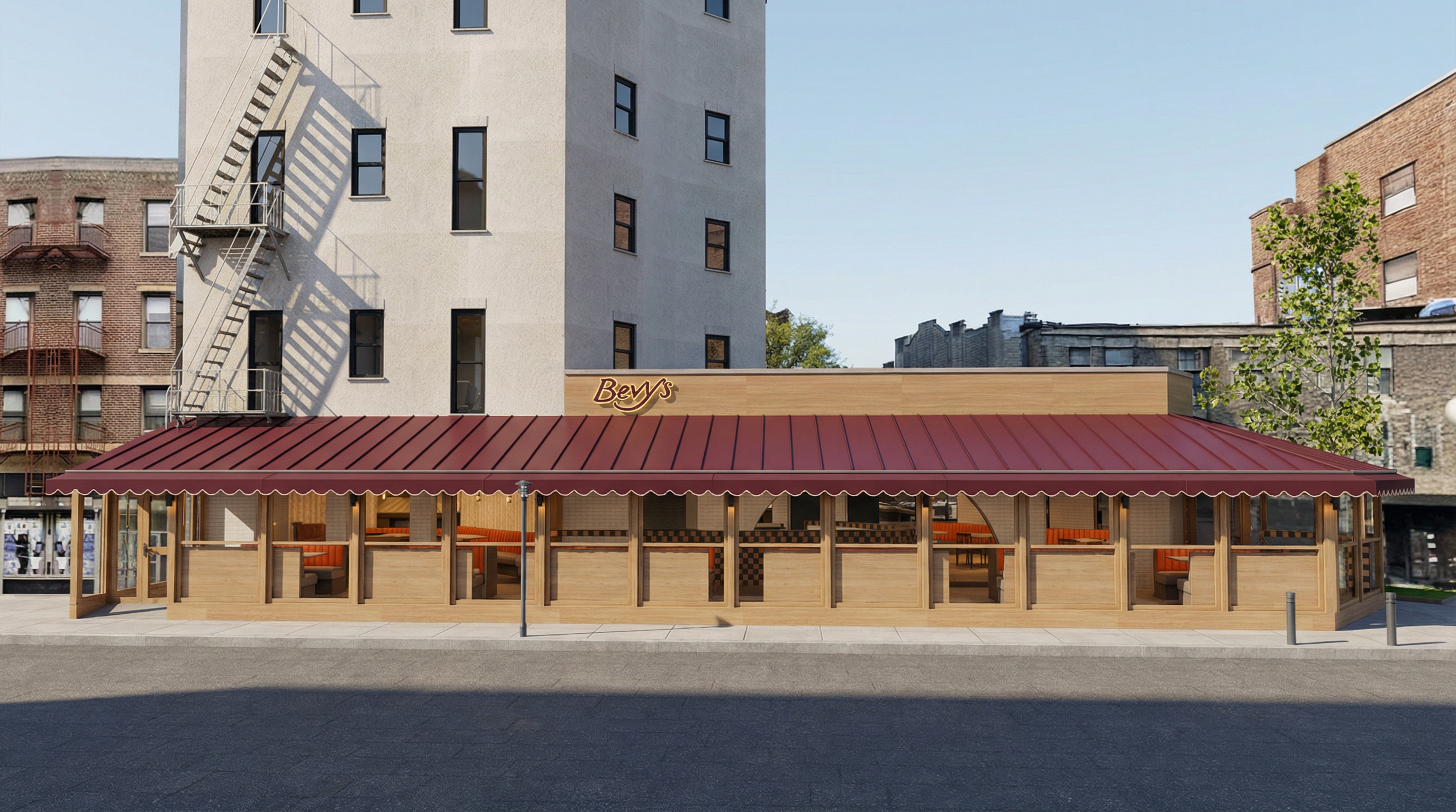 photorealistic neon sign reading bevy s in rich maroon letters with a bright glowing orange yellow neon tube outlining each letter shown isolated on a clean white background with no shadows no environment and no additional elements