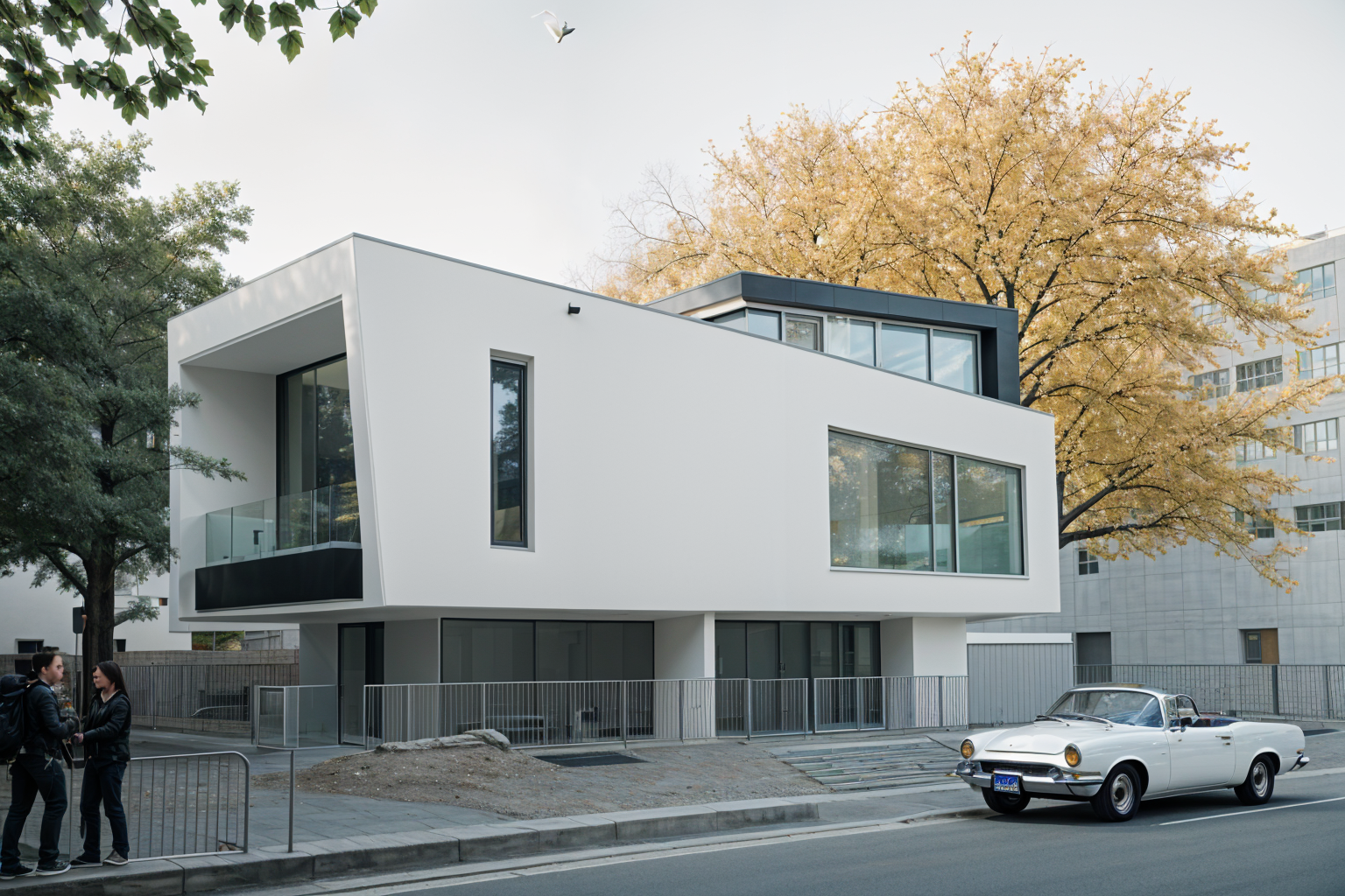 north idaho pine trees in the back ground white vertical board and batten siding throughout asphalt shingle roof the house is sitting on a hillside the side shown is the uphill side and it will overlook a treed mountain valley behind add asphalt driveway to the left of the house and a walkway to the front door