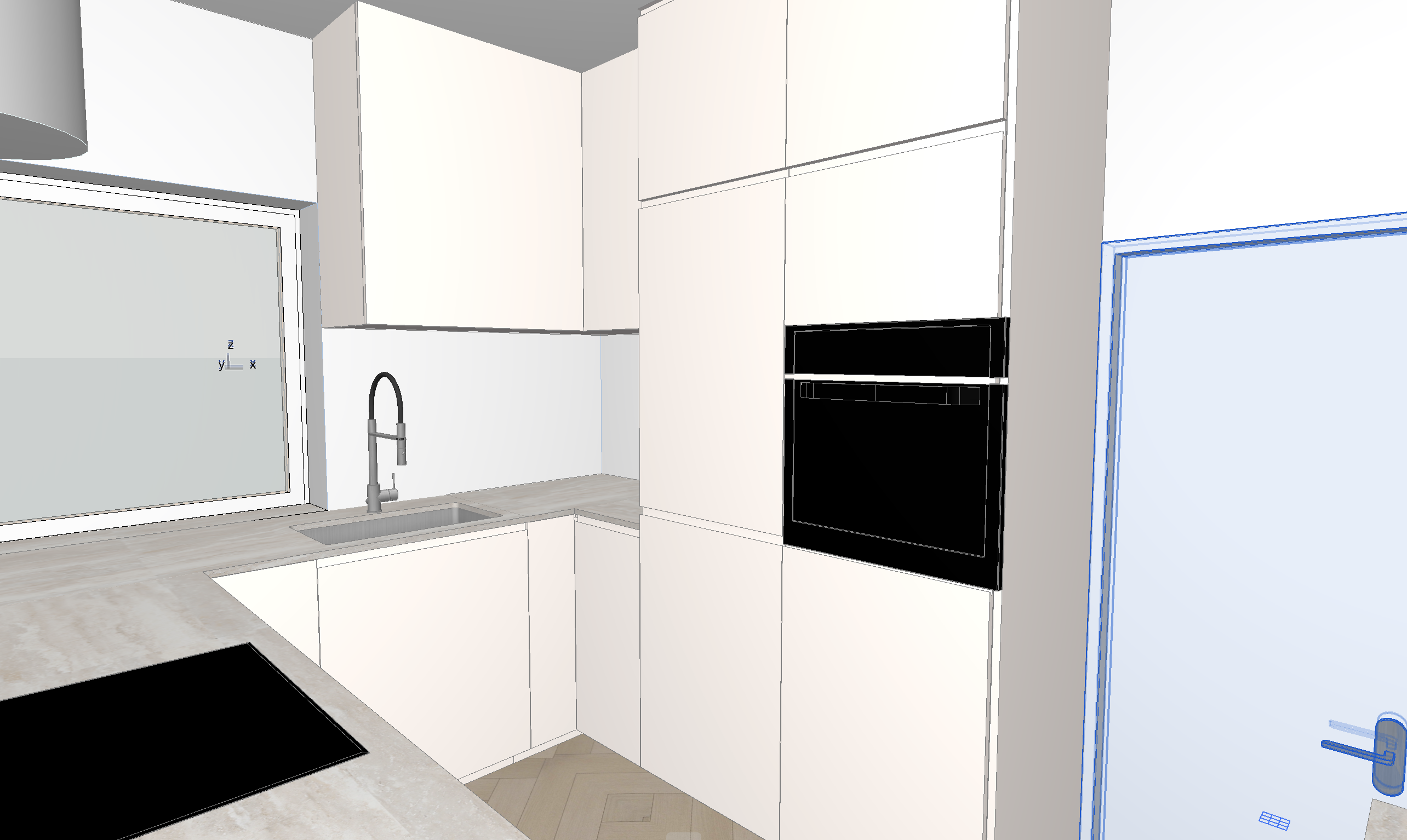 modernist interior shot create a modern minimalist kitchen with sleek white cabinets a light beige marble countertop and a matte black built in oven use a light cream color for the walls to complement the cabinets add a stainless steel faucet and sink giving a sense of upscale elegance illuminate the scene with soft natural lighting streaming in from a large frosted glass window set a warm and inviting atmosphere with gentle shadows reflecting a clean and sophisticated design architecture