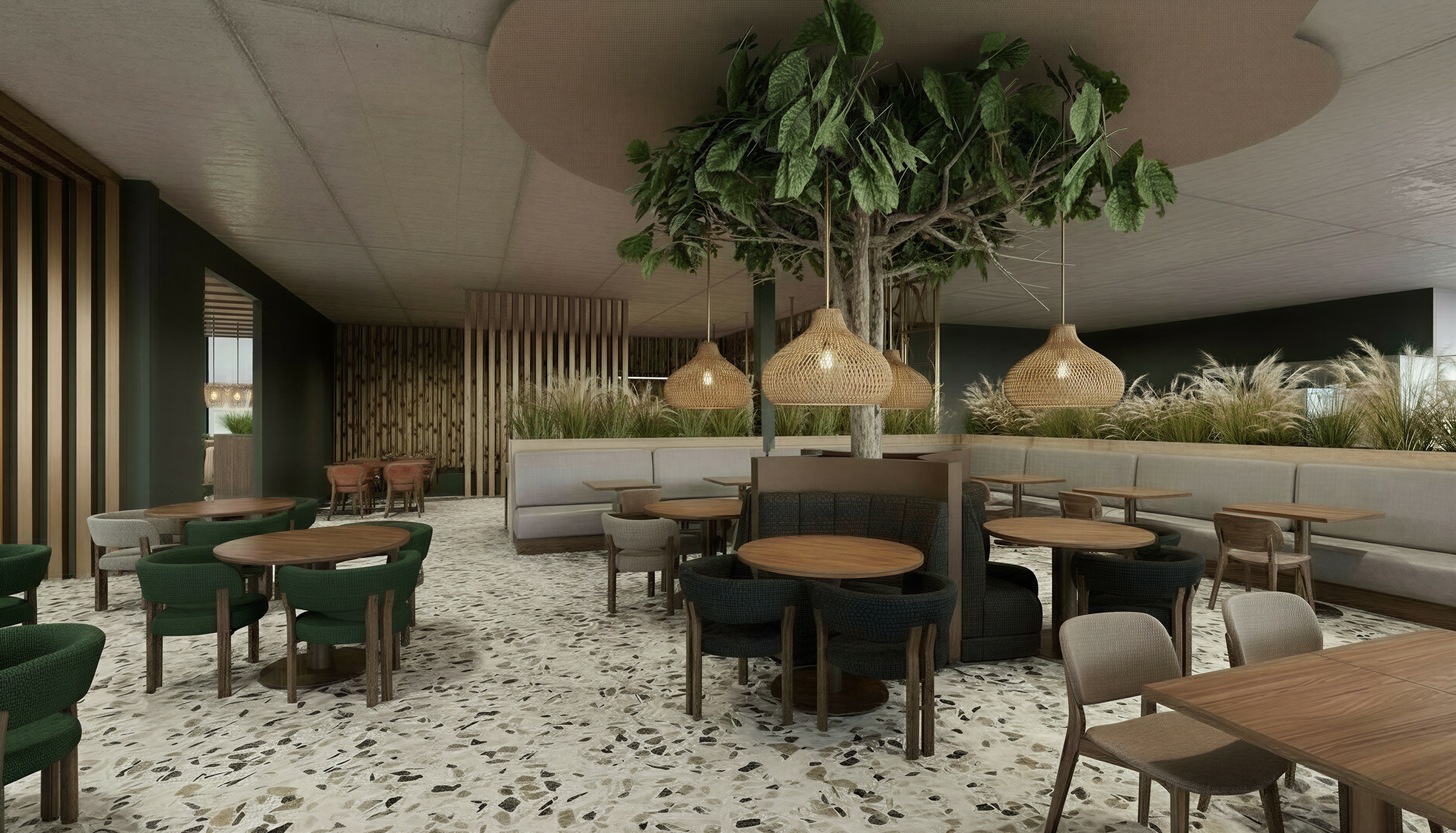 hyper realistic architectural photography high end interior design soft natural sunlight streaming through windows long soft shadows subtle ambient artificial lighting dimmable warm led accents realistic textures 8k resolution highly detailed shot on phase one xf global illumination raytraced reflections clean minimalist aesthetic lock all previous settings subject a targeted modification exclusively for all separate lounge chairs on the right side of the composition these specific chairs retain their exact form and their rich walnut wood legs their complete padded upholstery is re rendered in a coarse grained highly tactile dark green boucl textile with pronounced loops all other scene elements including the cars the curved modular sofas on the left and all landscaping remain identical