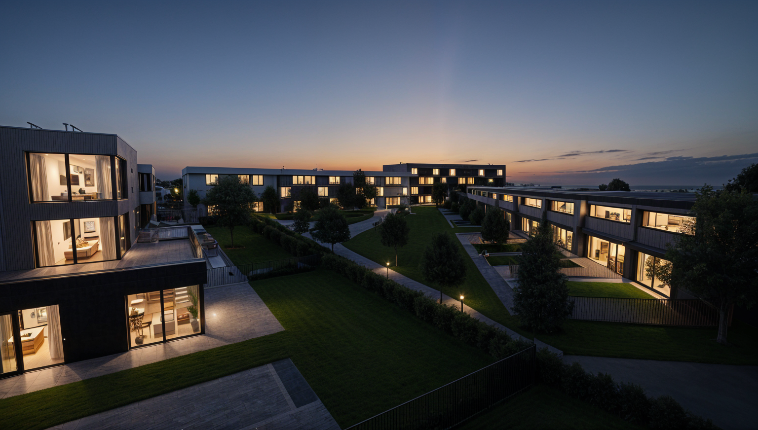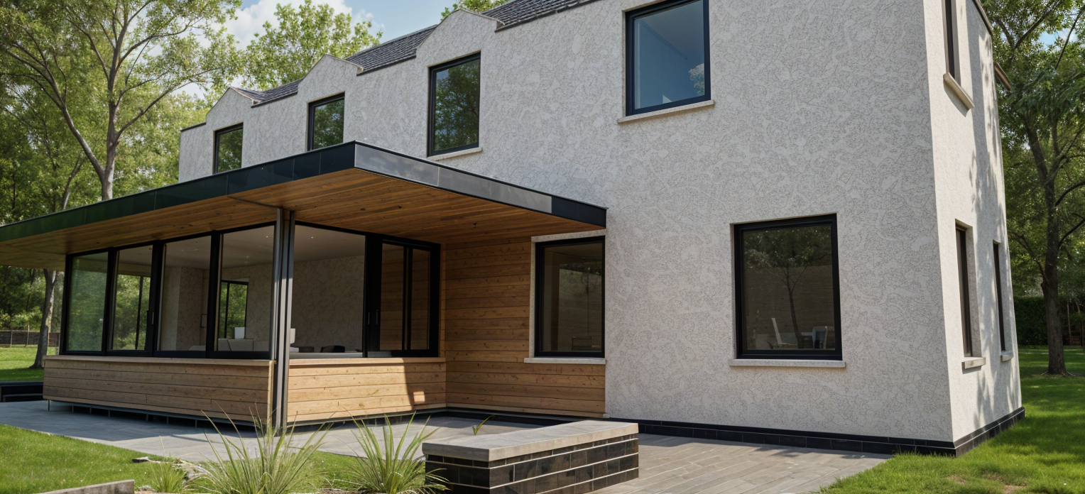 render a modern architectural cutaway of a house use sleek metallic textures for the steel framework and white for the exterior walls apply natural wood tones for the interior floors and staircase add a cozy living room setup with grey sofas and a wooden coffee table the dining area should have a large wooden table and white chairs create a bright inviting atmosphere with natural light filtering through large glass windows the overall color palette should consist of neutral tones with accents of dark blue for interior walls the setting should exude a warm and contemporary vibe architecture