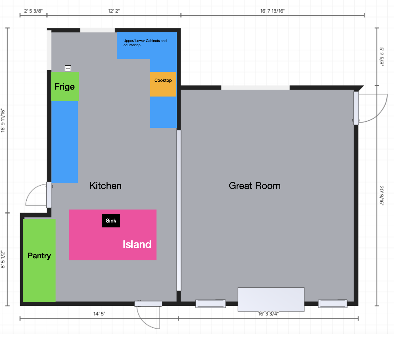 create a rendering of a new kitchen remodel we are working on modern shaker style cabinets in blue kitchen island to include sink dog bowls and dishwasher follow text highlights on uploaded image