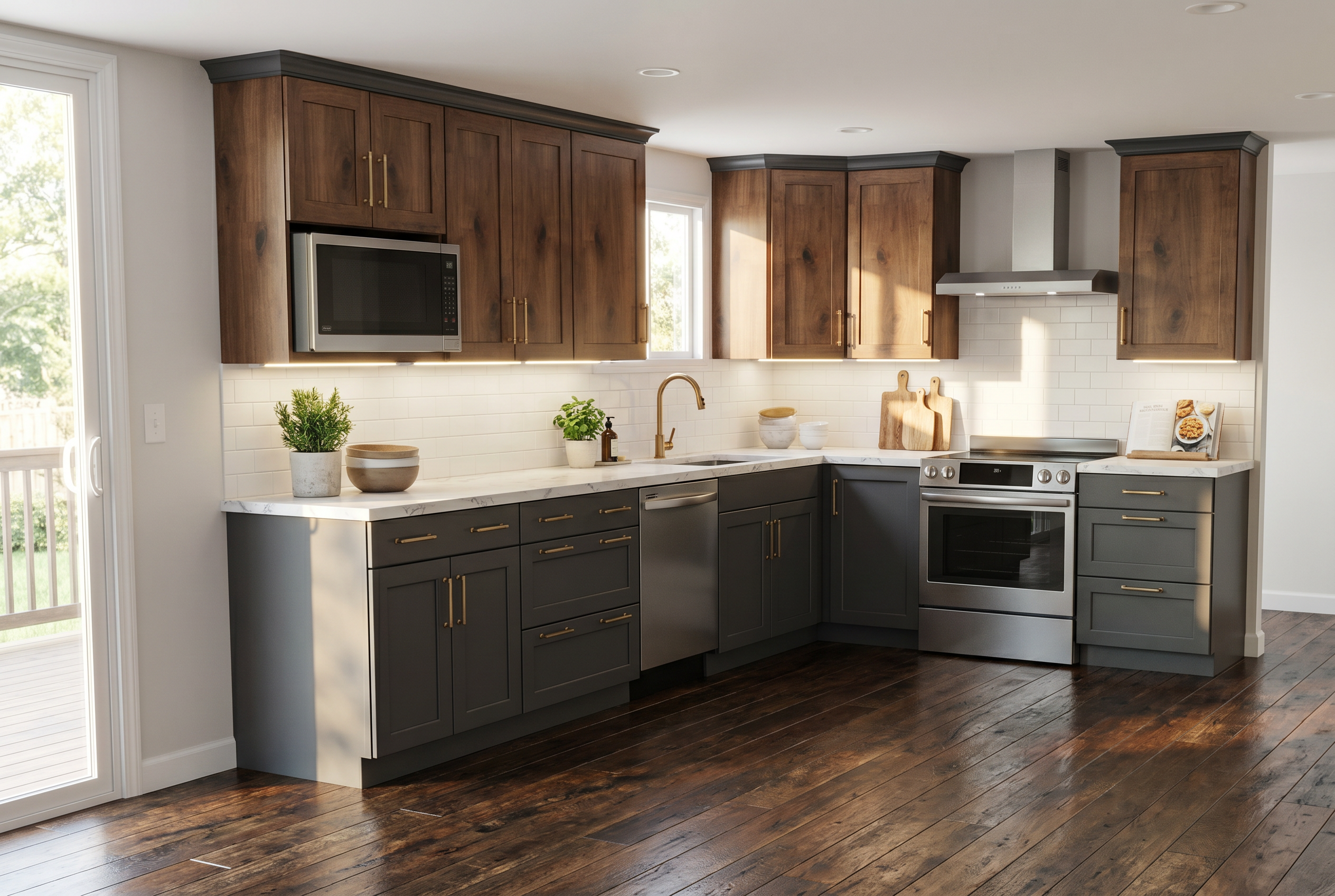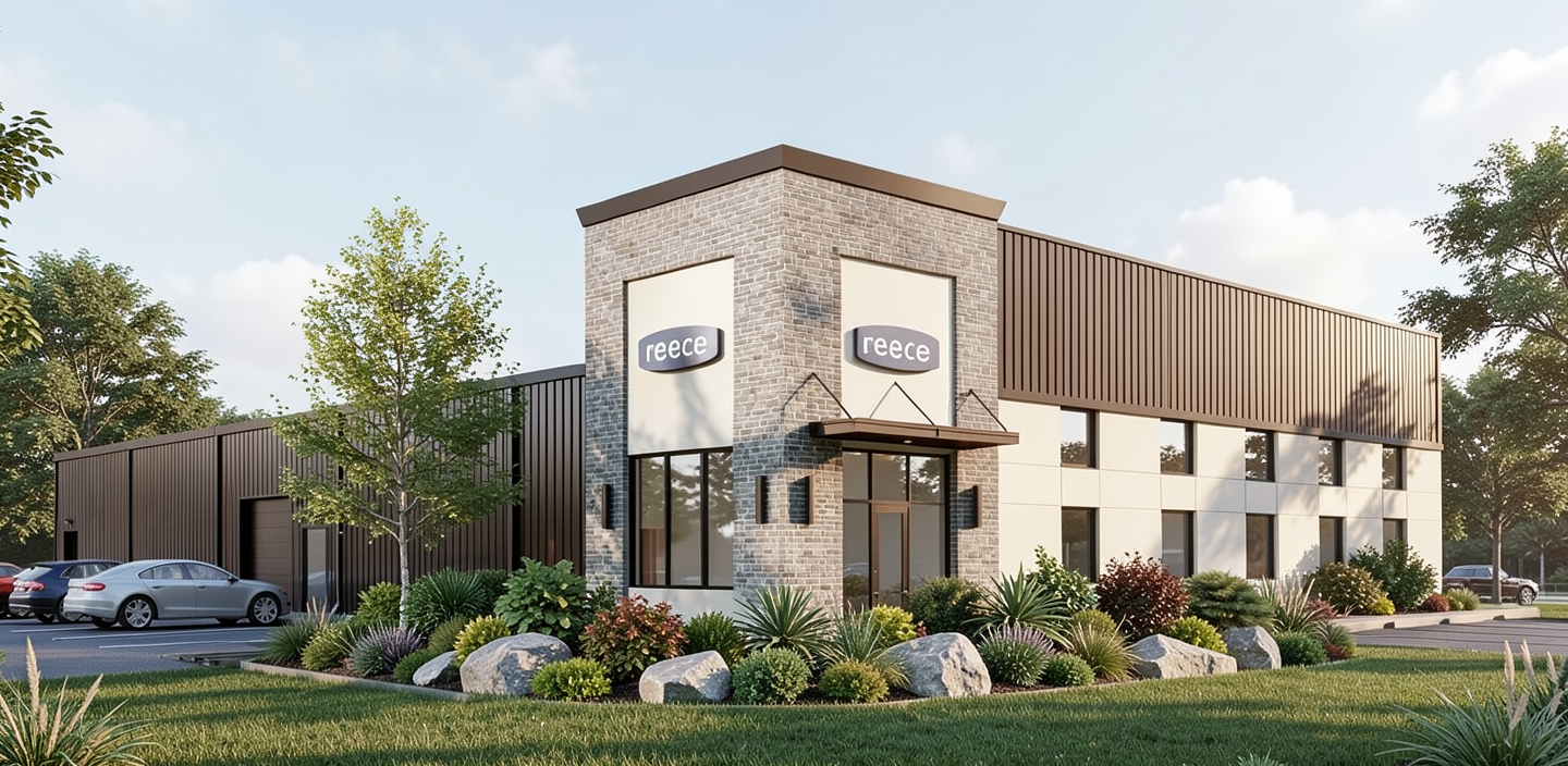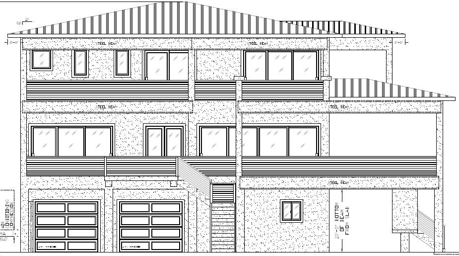 render this house with black framed windows and doors make the body of the house a cream color the railings black and the roof and garage doors a dark greyish bronze make the railings black horizontal bars the landscaping is tropical with the ocean off to the right change the body of the house to cool beige very light on the right hand side second and third floor these are open porches with ocean views add some outdoor seating