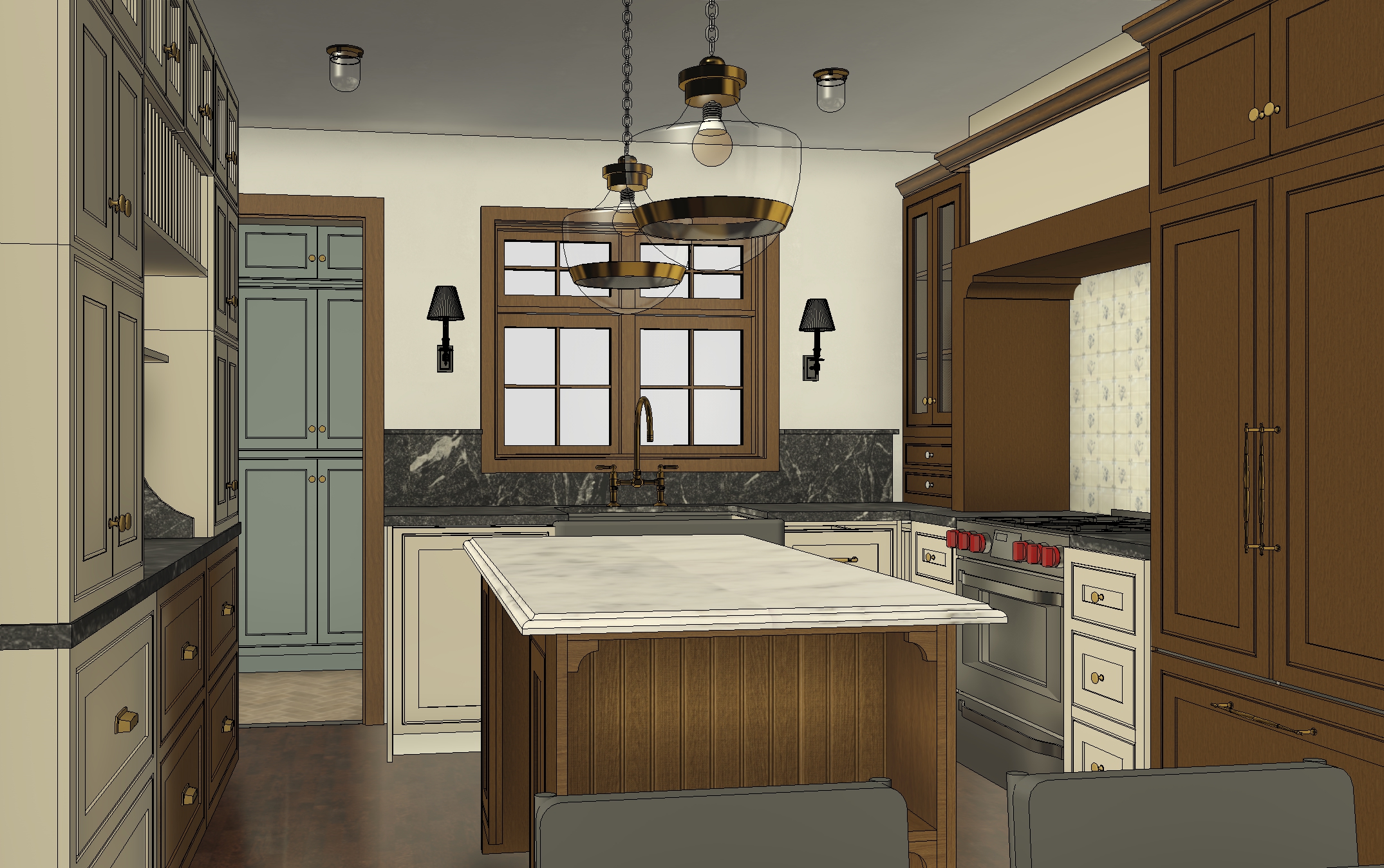 cabinetry in other room to be painted farrow and ball denimes add garden scene outside of window