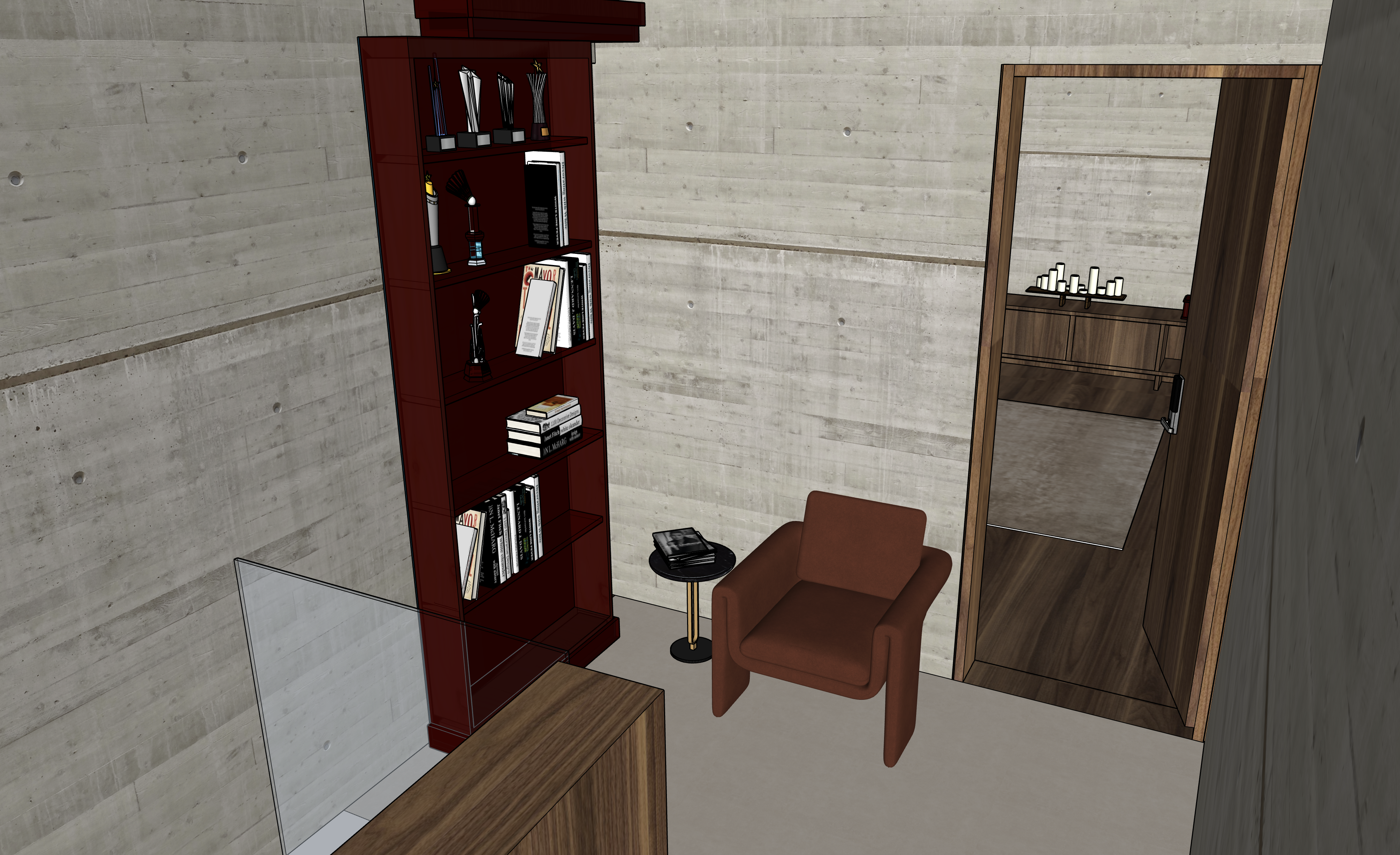 residential design minimalistic contemporary approach hidden door design and meditation room indirect lighting in meditation room and spot lights on furniture beige large format ceramic tiles the walls in lazy concrete
