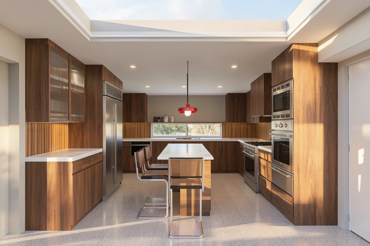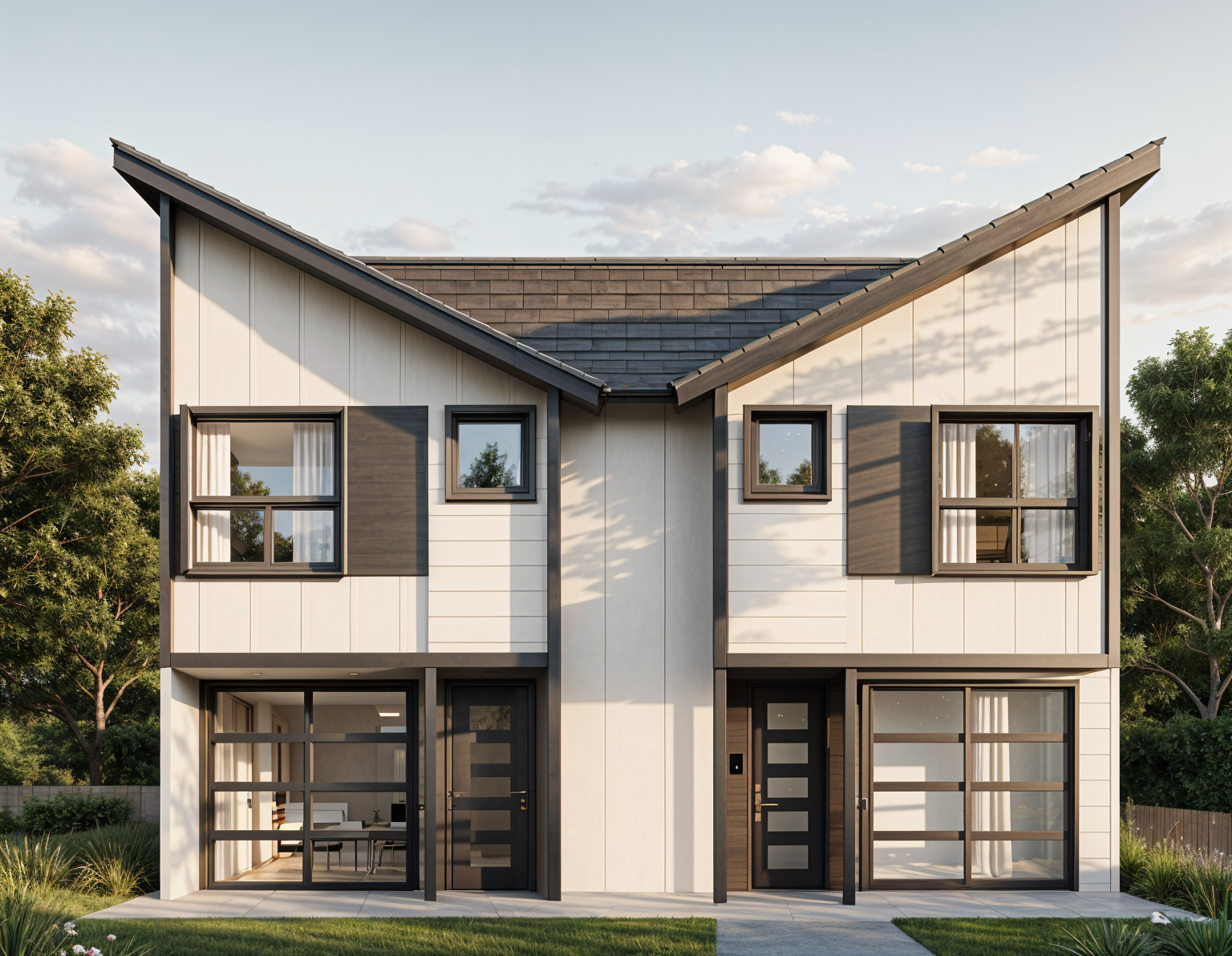 transform this home into a more modern architectural style with a flat roof replace the pitched roof with a clean flat or low slope roofline simplify the overall form into a more boxy geometric massing use modern materials such as smooth stucco vertical wood accents and dark metal or black window frames keep the structure realistic and consistent with urban residential development maintain a clean minimal design with sharp lines and balanced proportions enhance lighting and realism to create a high end modern home suitable for a real estate listing do not use farmhouse or traditional design elements