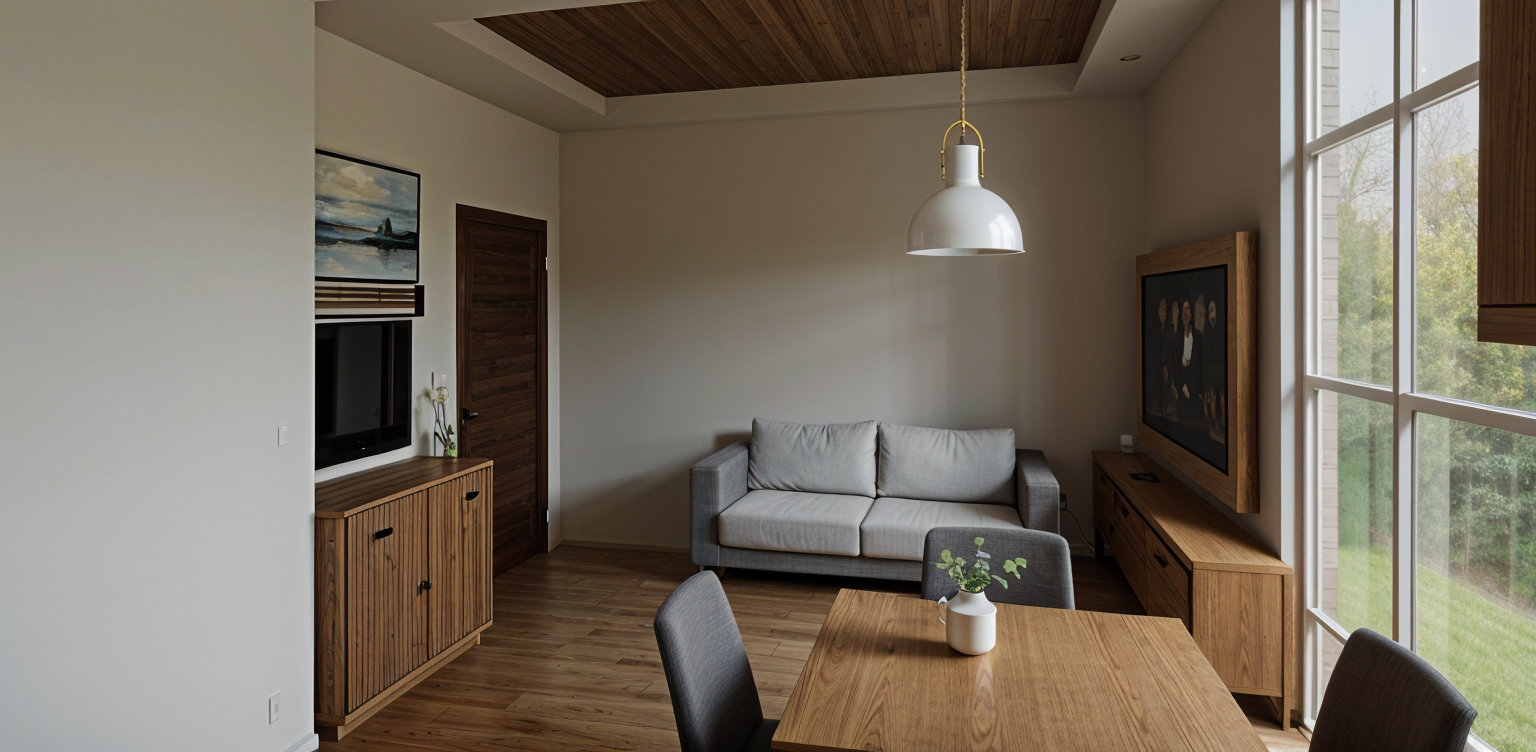 make it realistic white frame mirror beside dining table window with blinds to ceiling by the sink