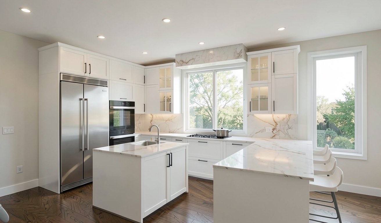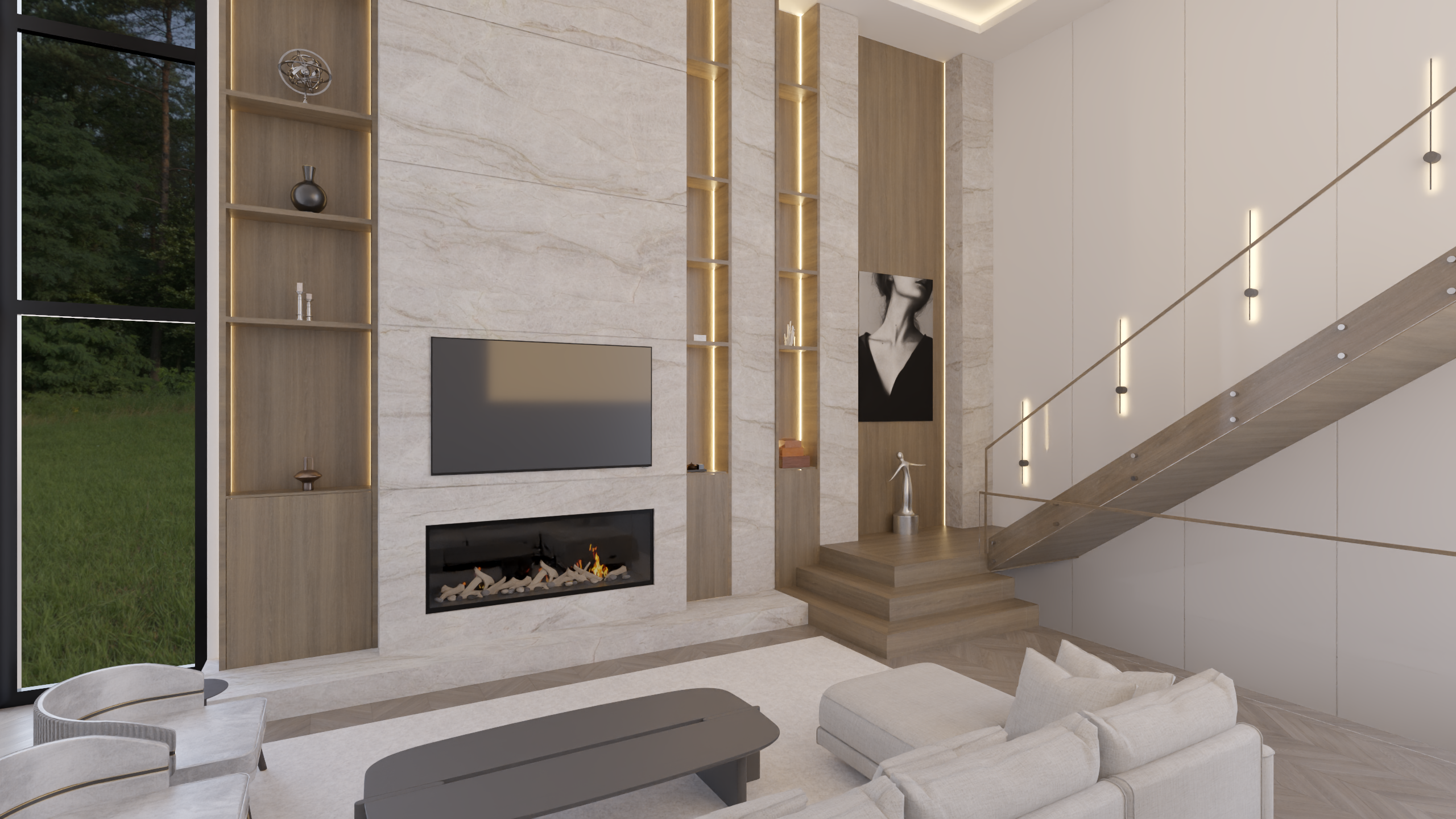 do not change the structure or model keep original texture a modern minimalist interior featuring add warm tone cabinet light