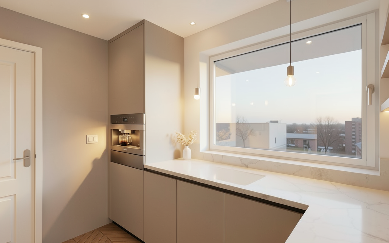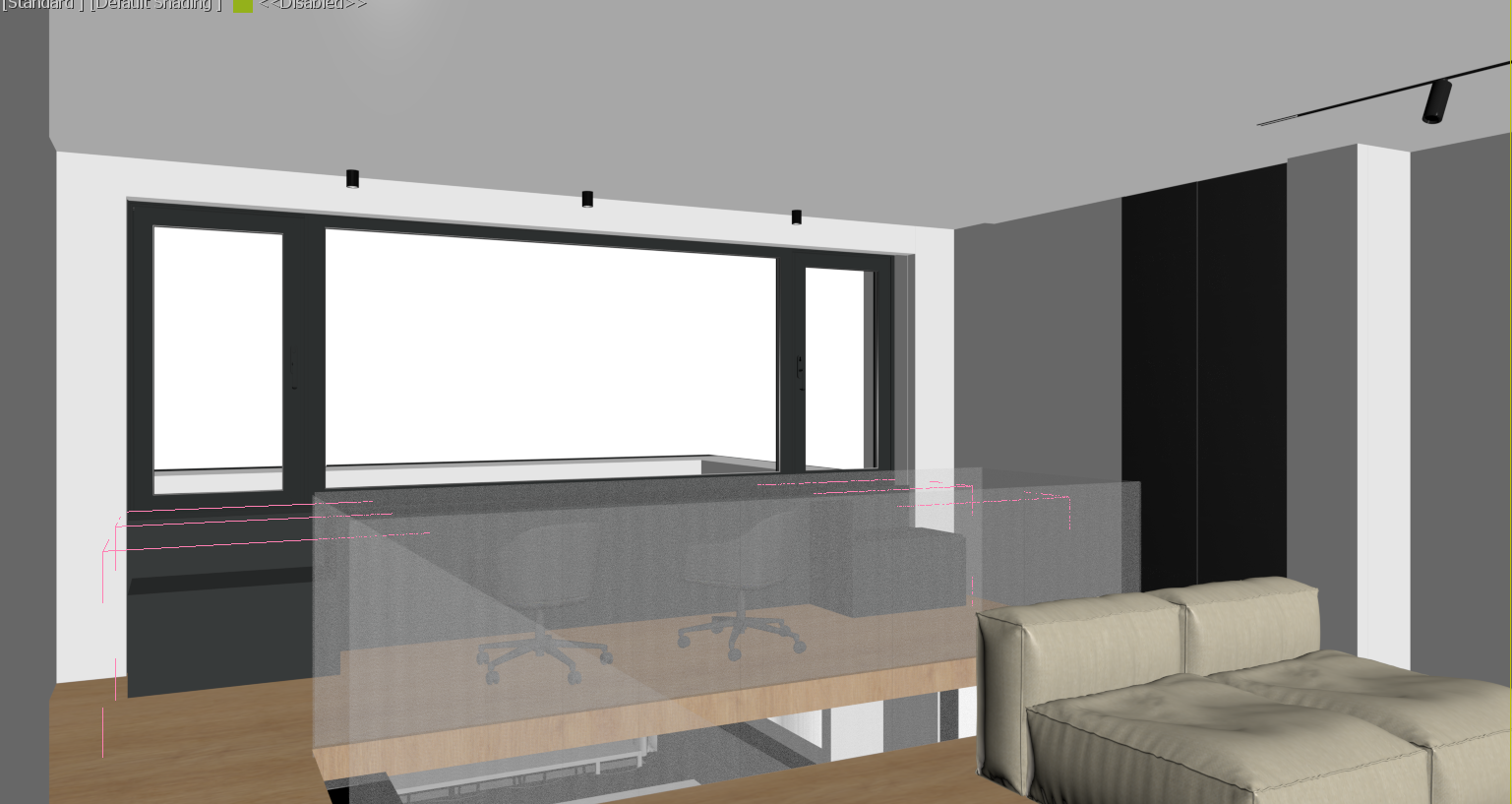 modern interior design with a cozy workspace by a large window soft white walls and a warm light white ceiling create an inviting atmosphere two comfortable ergonomic chairs in beige are placed near the window facing a minimalist desk the overall feel is contemporary and serene with a touch of luxury perfect for productivity and relaxation outside the window add some greenery in the distance improve rendering quality and realism the sofa is beige black cabinet on the right with two black mirror doors make glass railings more transparent the chairs near the table should be black