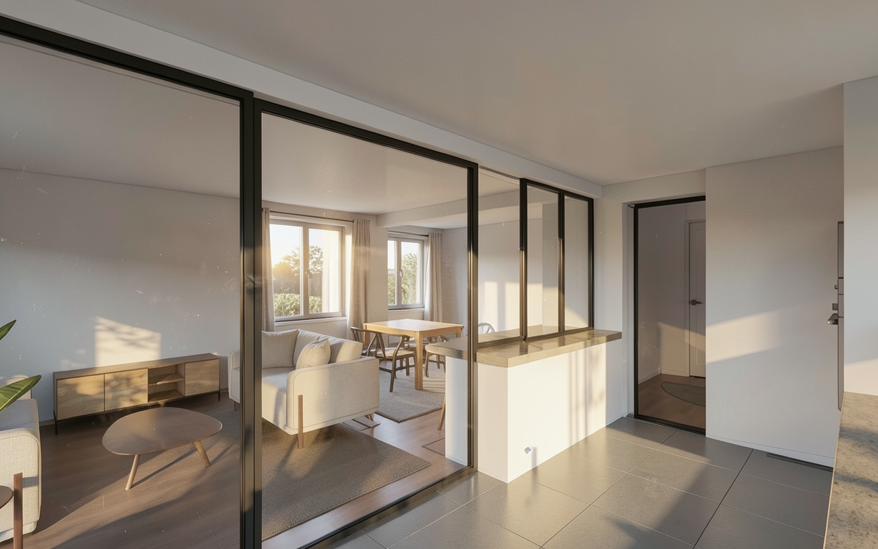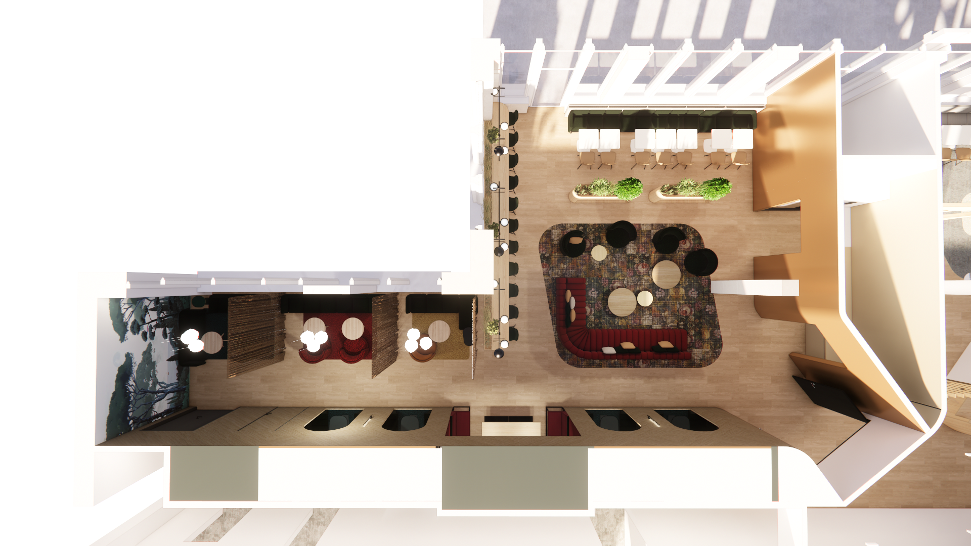 render an elegant modern interior layout from a top down perspective use natural wood tones for the flooring complemented by rich maroon and deep red for the seating areas incorporate lush green plants for a touch of nature against white furniture design walls in soft earth tones with abstract art highlight the space with warm lighting casting soft shadows creating a cozy inviting atmosphere perfect for social interaction