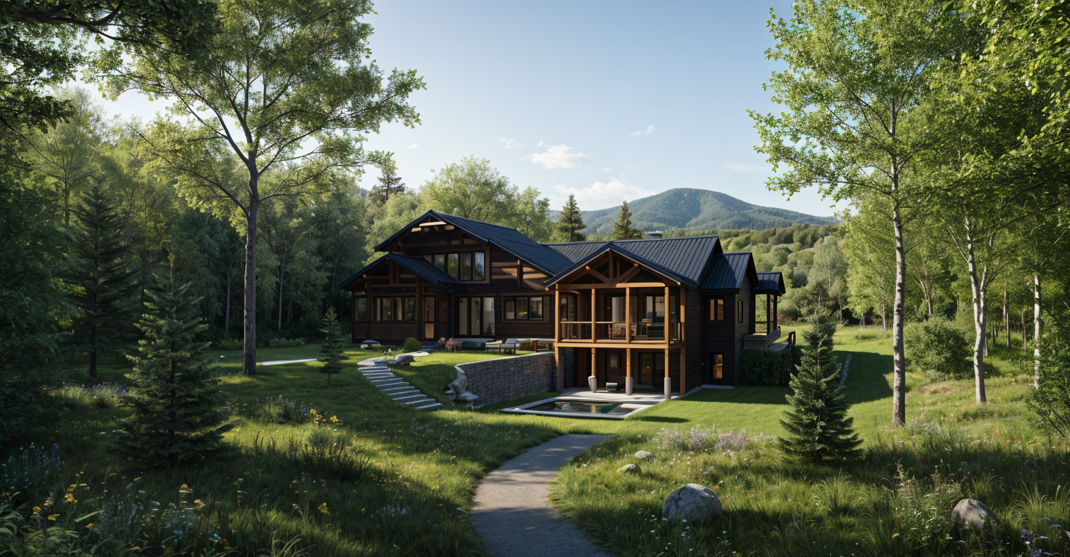 house in a forest in mont tremblant quebec sunny morning close to noon black metal roof black windows black doors wood accent and dark wooden finishes architecture