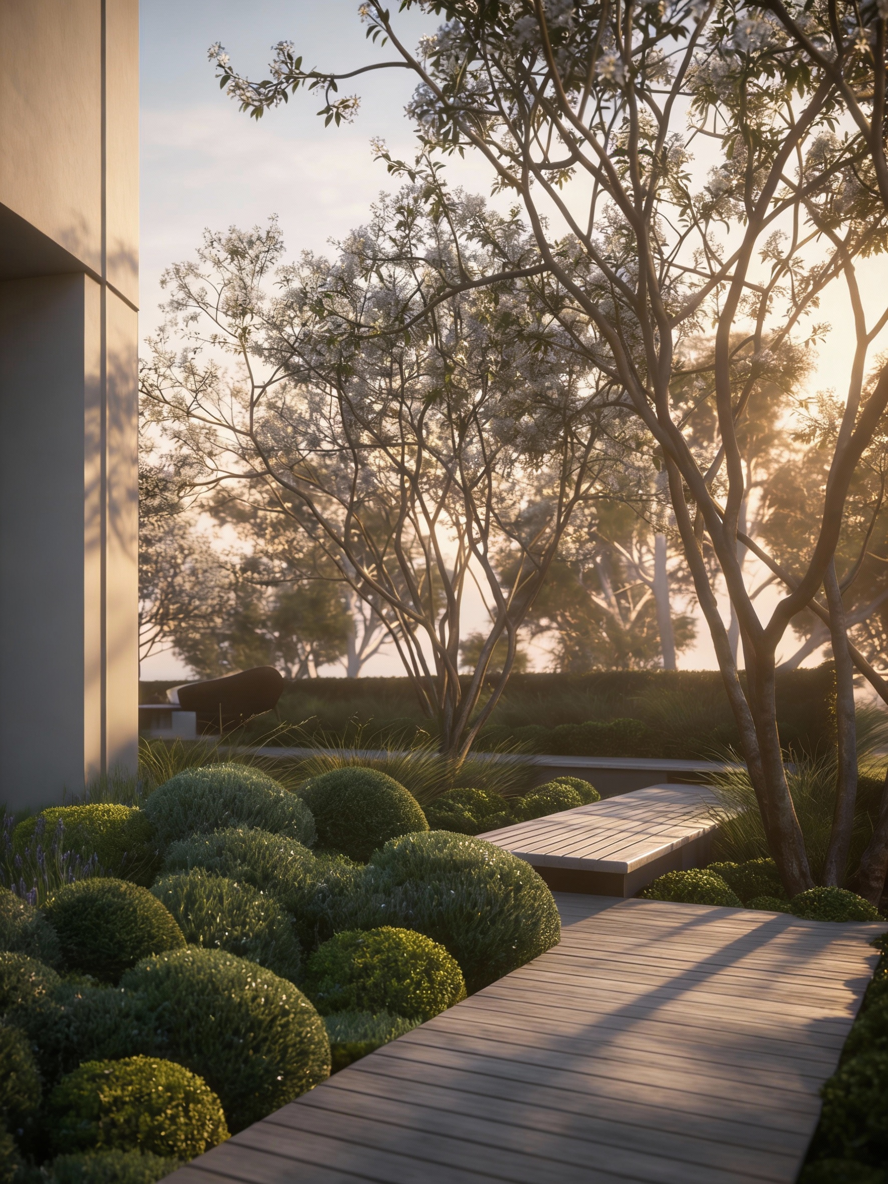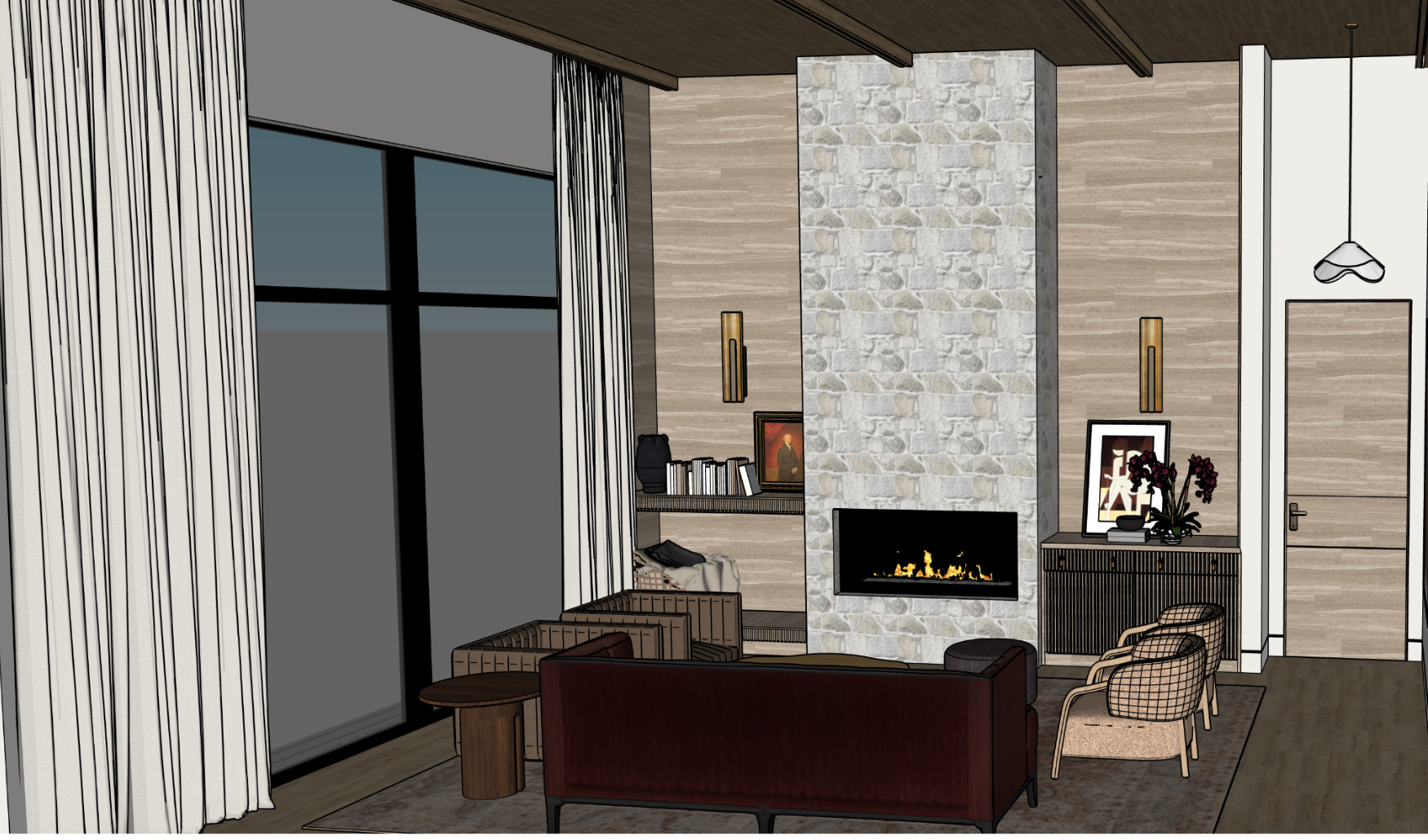 camera eye level 35mm lens lighting soft daylight warm interior quality high realism maximum exterior view through windows the large black framed windows open visually onto a covered exterior deck immediately outside the living room exterior deck wide plank wood decking in a warm natural brown tone boards run lengthwise clean and modern matte finish realistic wood grain no gloss no artificial shine structure black steel vertical columns supporting an overhang overhead soffit clad in warm wood planks matching interior ceiling tone recessed ceiling lights in the exterior overhang with soft warm glow exterior walls stone exterior wall visible through glazing stone matches the fireplace stone family with warm white and light gray tones natural hand set appearance furniture minimal modern outdoor lounge seating neutral cushions in warm gray and soft taupe low profile outdoor chairs and sofa simple concrete or stone coffee table clean uncluttered arrangement railing slim black metal railing horizontal or cable detail minimal visual obstruction to view landscape and view soft natural landscape beyond deck trees and distant hillside calm muted outdoor palette no urban elements no people lighting relationship exterior lighting is subtle and secondary interior remains the visual focus warm interior light softly reflects on window glass realistic glass reflections and transparency rendering instructions specific to exterior exterior visible only through windows do not turn scene into exterior render do not alter interior lighting balance maintain interior camera position maintain depth and realism through glazing soft atmospheric depth outside
