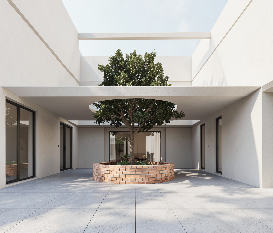 transform this bedroom photo into an ultra realistic rendering preserving the exact layout and proportions enhance all textures materials and lighting for maximum realism emphasize the soft natural light coming from the window warm ambient tones and the interplay of shadows on the bed and accent wall reproduce the organic textured feature wall with high definition detail maintain the existing d cor arrangement including the pendant lights bedside tables bedding layers curtains and shelf items highlight fabric textures wood grain matte and glossy surfaces and subtle color variations detect the interior design style modern warm minimalism with organic elements and recreate it with refined decorative details that match this style ensuring a cohesive elegant and realistic final image