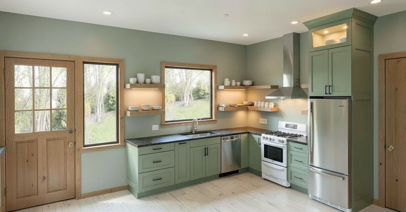 darken the wood shelving and trim darken the wooden floor add tile backsplash