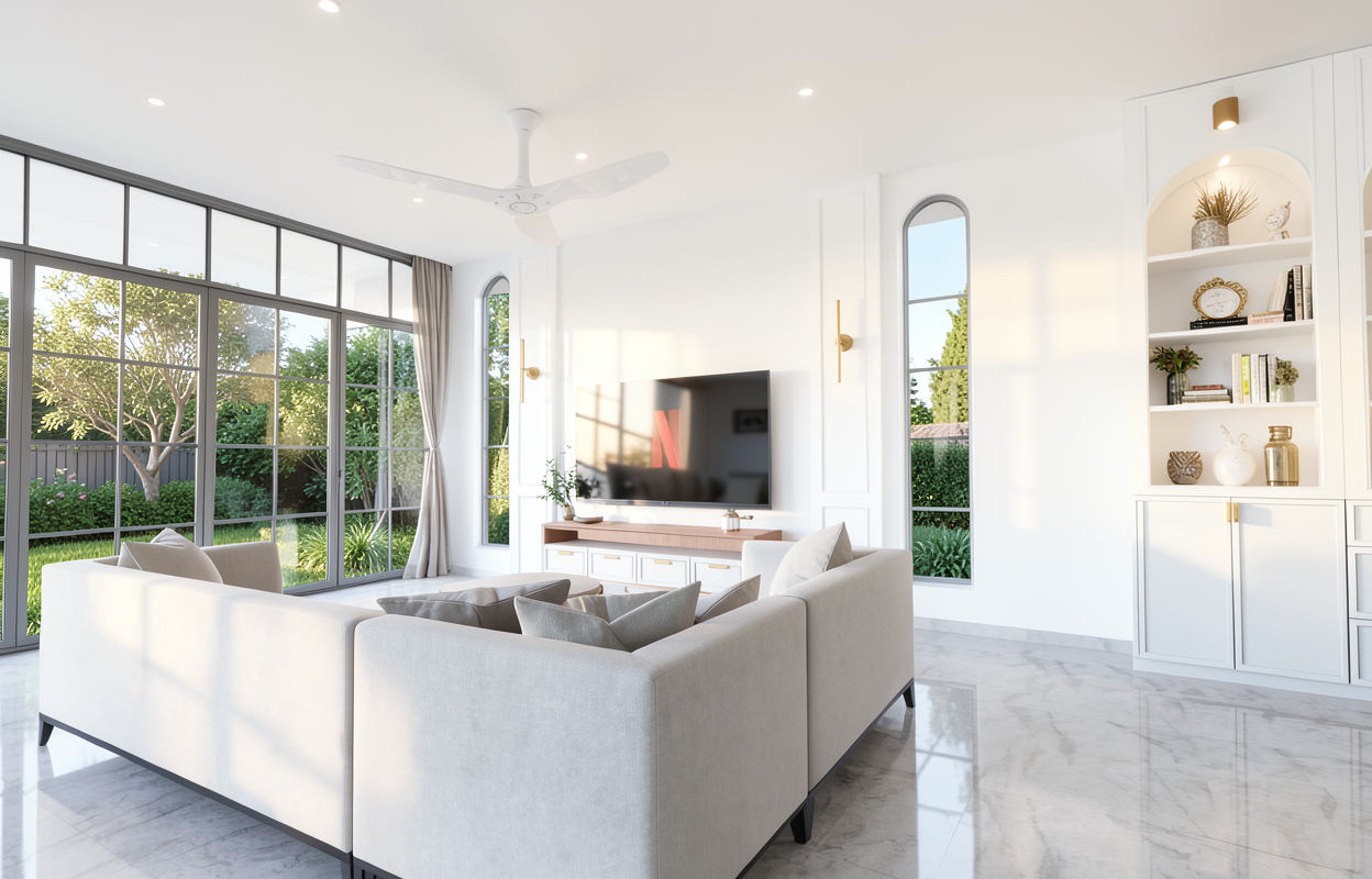add some simple landscaping outside the doors and windows change the bookshelf on the right to be white in colour change the wall colours to be white change door and window frames to black change curtains to day and night curtains