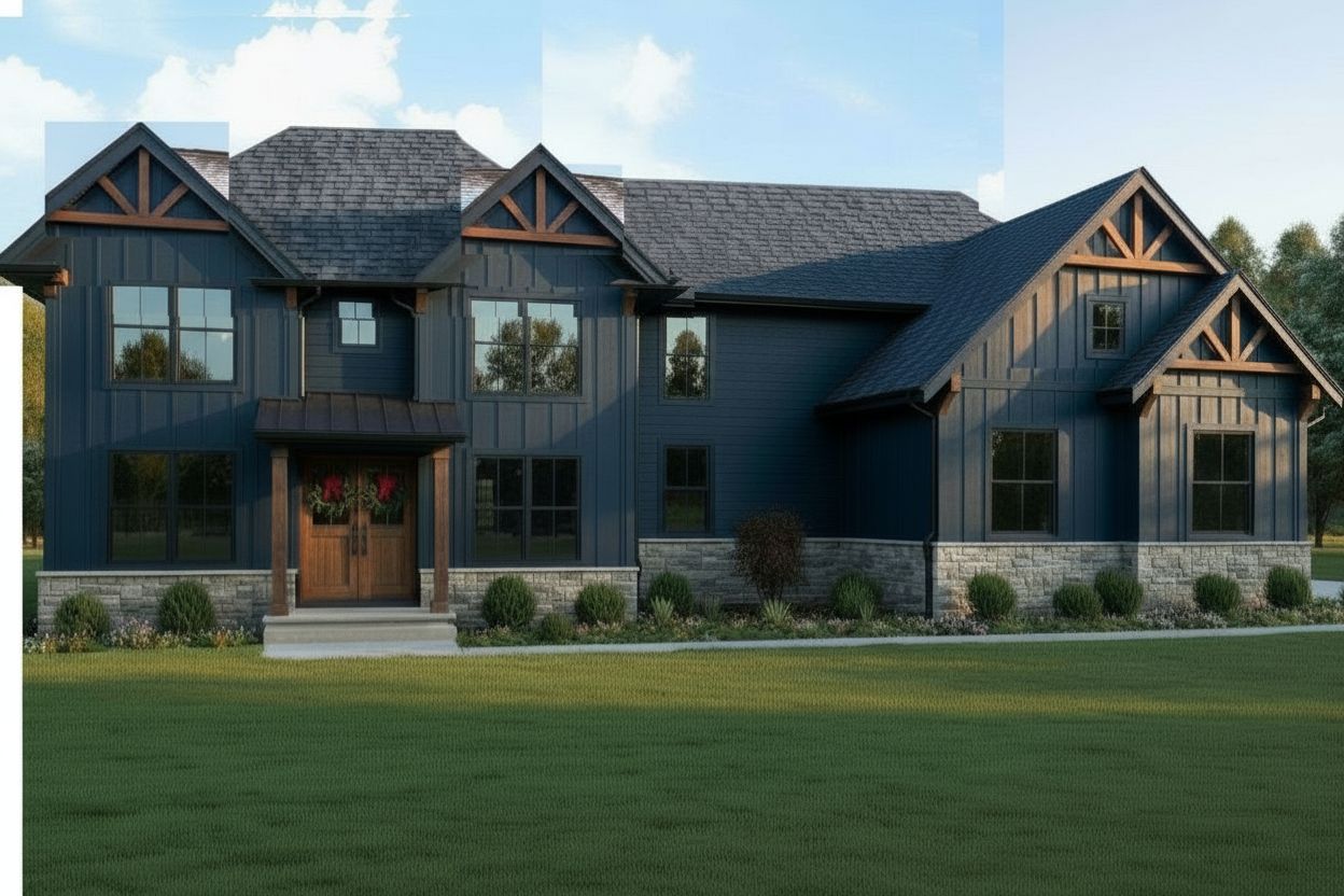 blue siding and roof line to line up correctly to look consistent throughout stone on upper roof area to be replaced with vertical siding