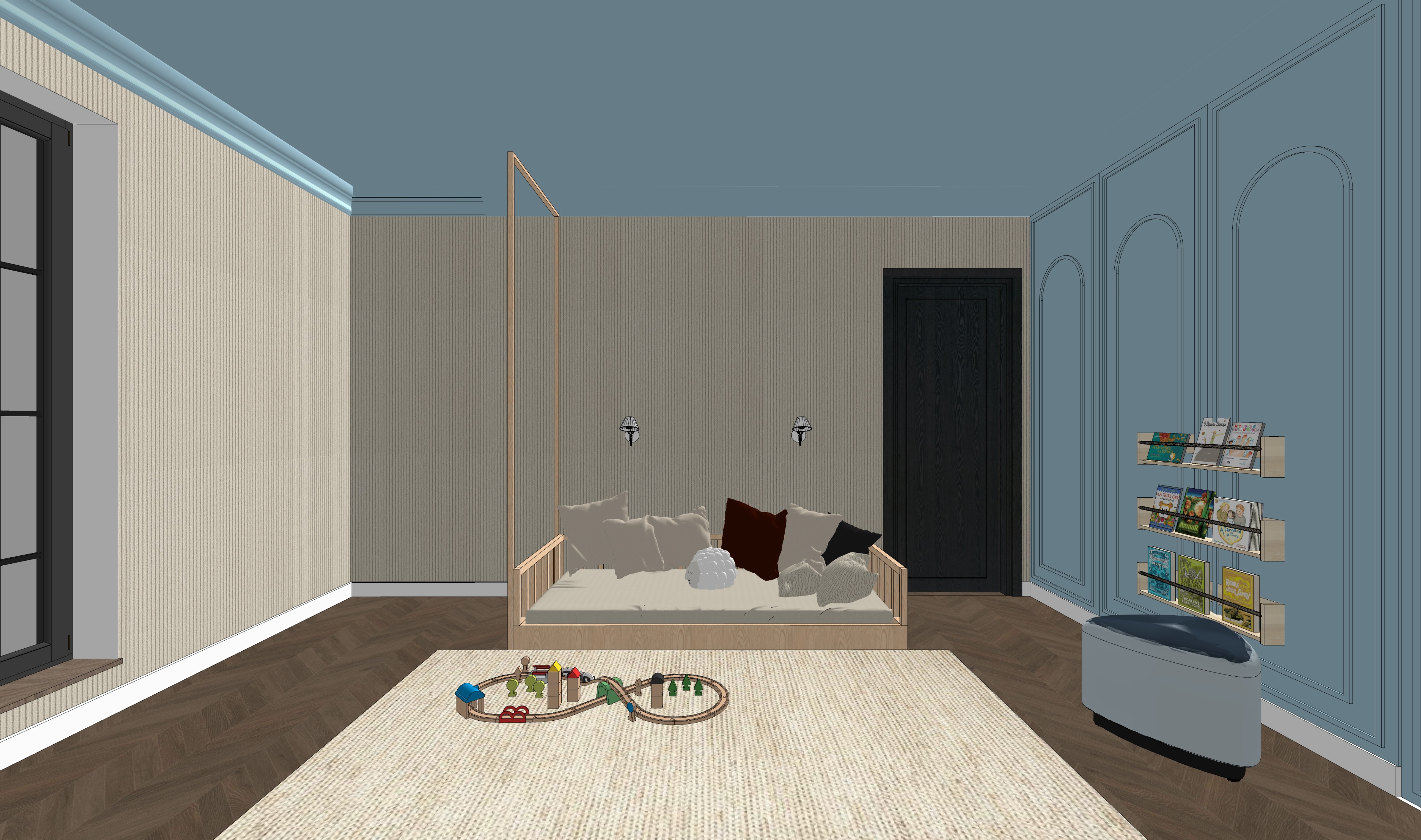 change the drawer for more like in playroom change the view outside there is no building outside add center lighting