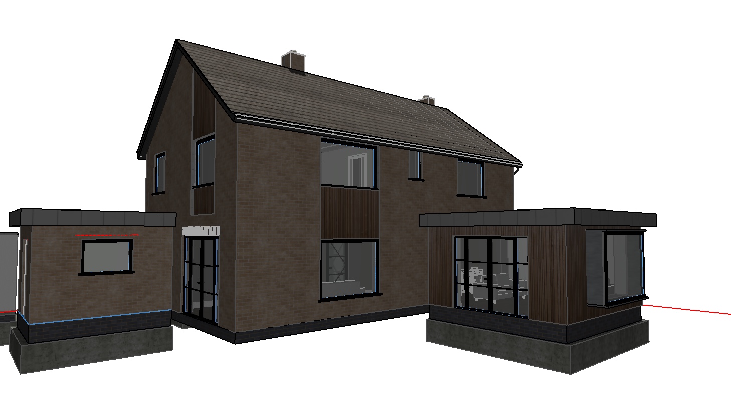 exterior shot exterior finish is buff brickwork with cedar vertical cladding panels all rainwater goods are black