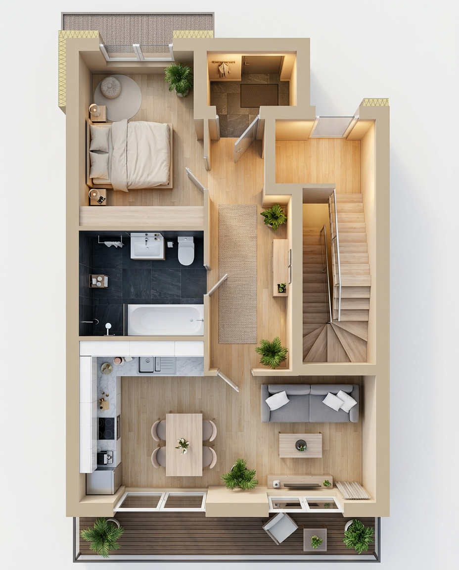 partly cloudy sky some deciduous trees in background add gutters white windows gray siding lake erie in background