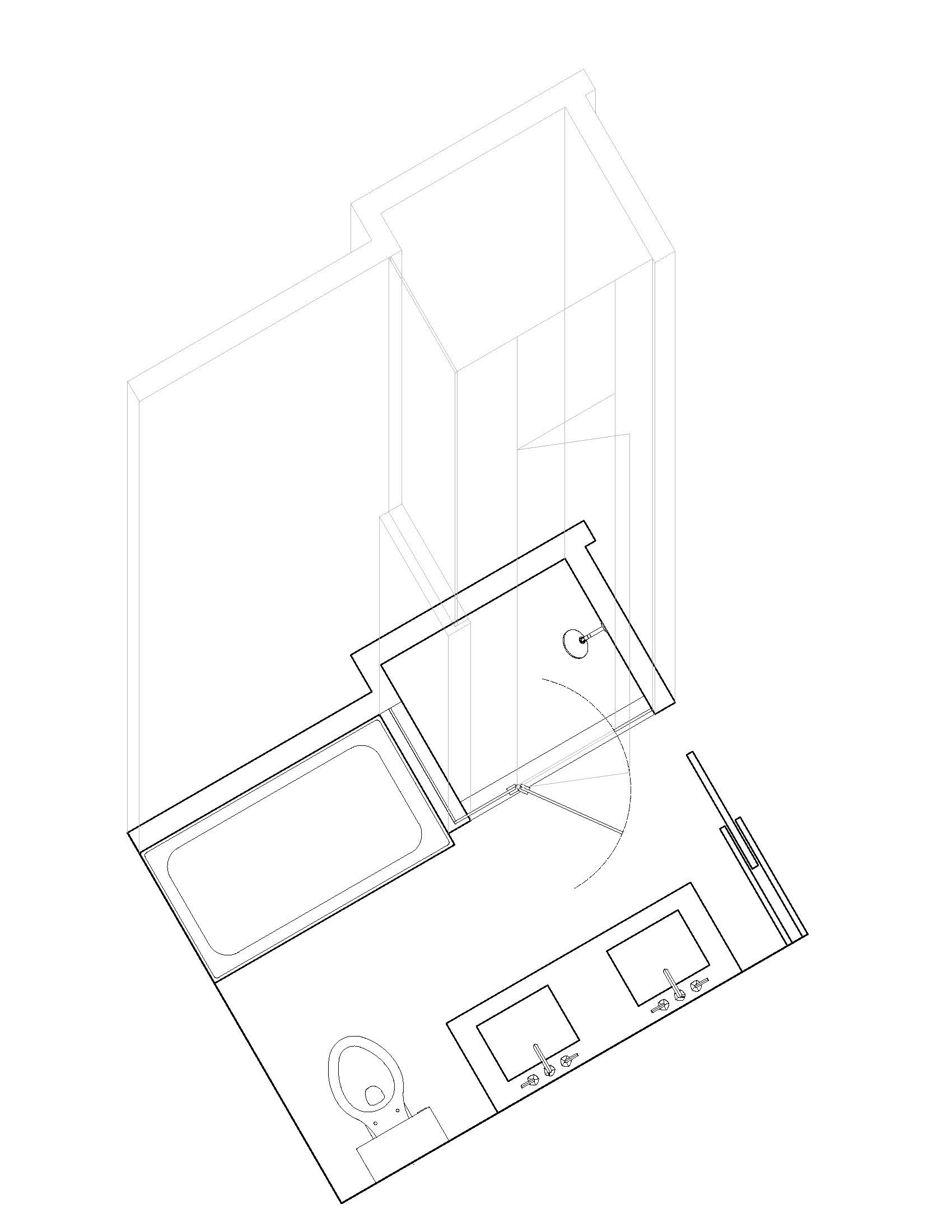 convert this floor plan into a architectural isometric 3d view of a bathroom show the space from an elevated angle with furniture walls and details visible create an isometric drawing of this bathroom from the floorplan provided and the vertical guideline sketches ontop of the floorplan to guide the isometric drawing use the same furniture as shows on the plan do not change the orientation of the floorplan