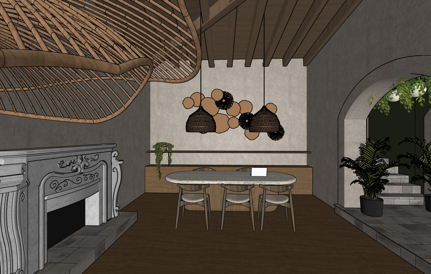 its a cozy work place it has wood floors and the ceiling has wood beams and wood paneling its inspired in a thailand resort add some decor on the shelf and iluminate the ceiling