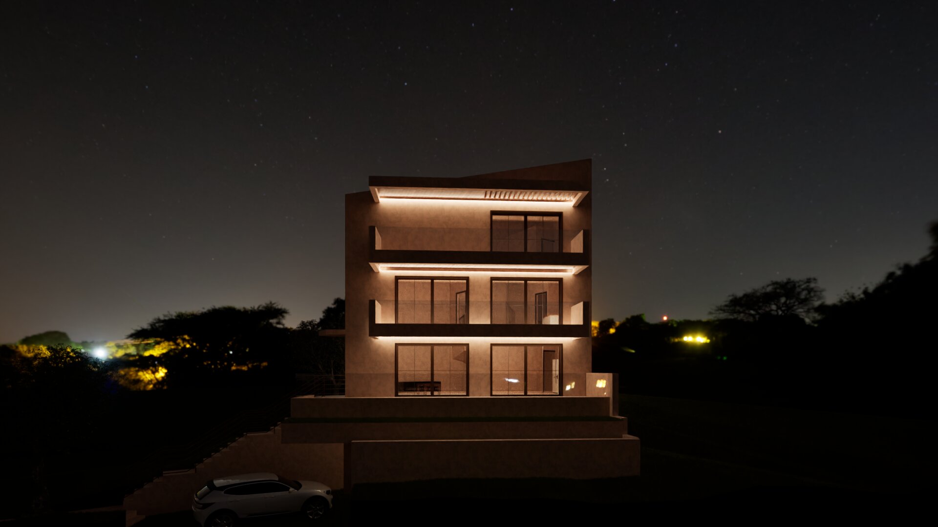 make it realistic add short mediterranean vegetation on the grass and few trees add outdoor furniture at the balconies add curtain behind the glazed windows add two people keep the night sky