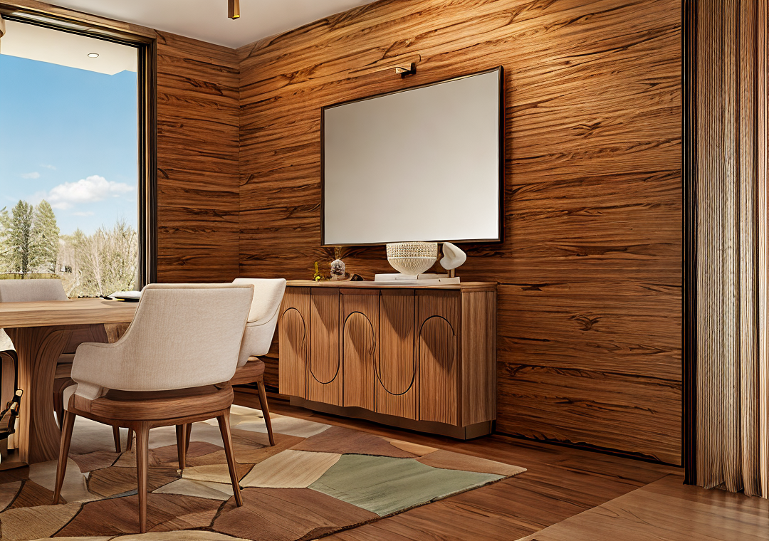 interior shot a modern elegant interior living space with a sophisticated atmosphere the kitchen cabinets are a sleek matte black contrasted with ivory countertops delicate lighting casts a warm and inviting glow throughout the dining table is set elegantly with ceramic white dishes and light gray placemats surrounded by chairs in a neutral taupe woven fabric large windows are adorned with sheer gray curtains allowing filtered sunlight to softly illuminate the room the living room features a cream colored plush sofa with rich burgundy and deep teal accent pillows complemented by a navy blue armchair a chic black spiral pendant light hangs from a coffered ceiling accentuating the modern aesthetic pale beige tiles cover the floor enhancing the airy feel
