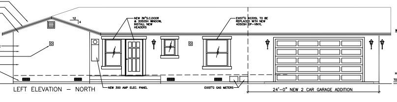 remove all lines and words and render this elevation with a composite shingle roof tan stucco white windows and a white garage door with driveway and grass landscape