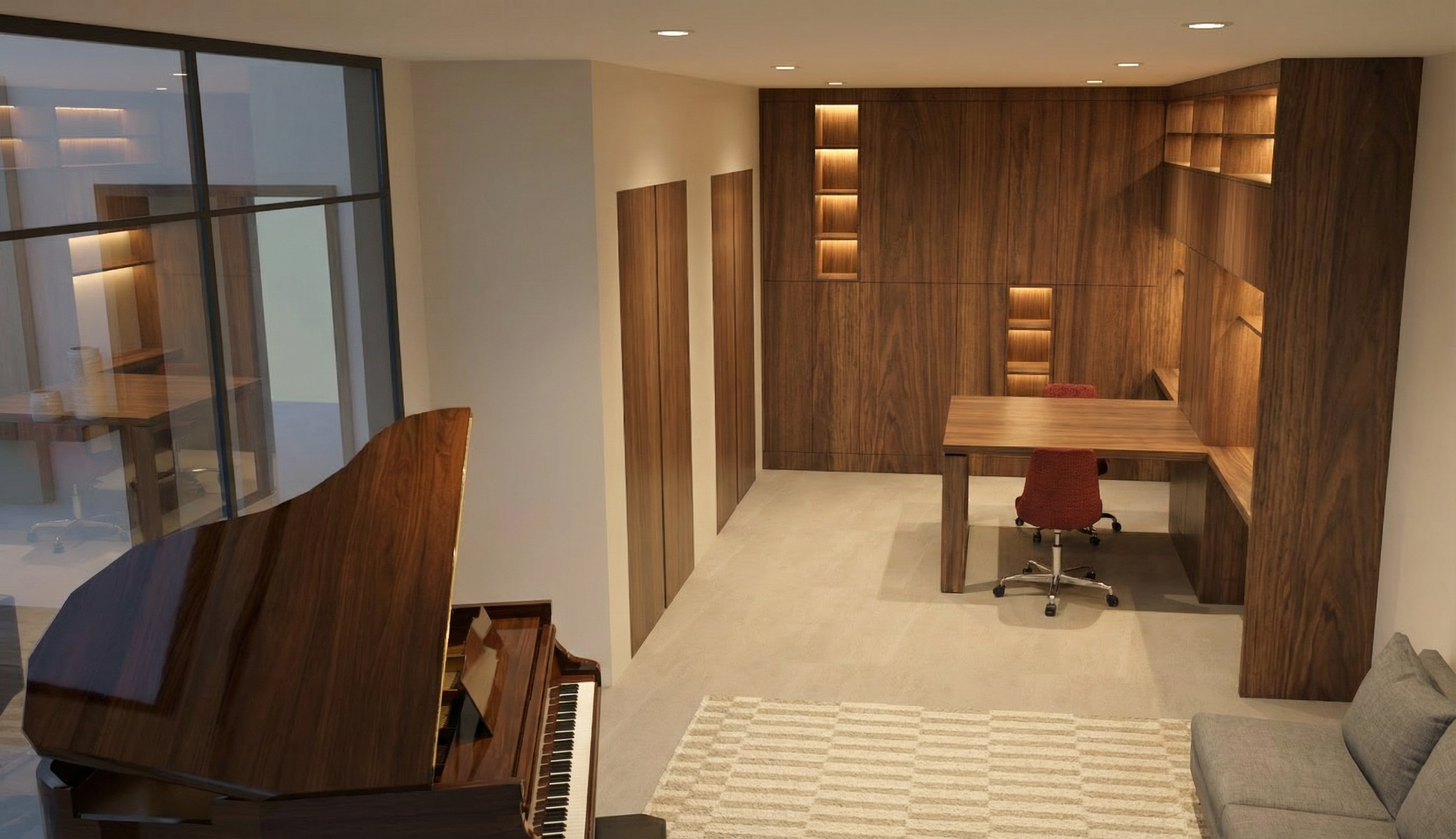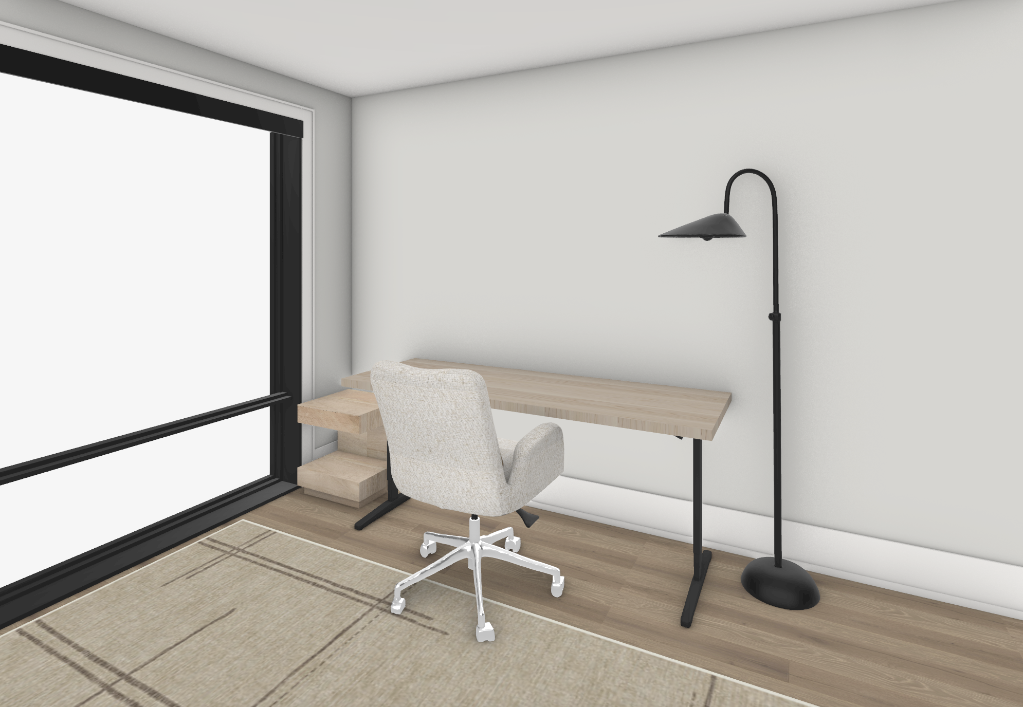natural lighting add a few accessories to desk and 2 black computer screens add a printer on top of side table add a background backyard view preserve colors and textures