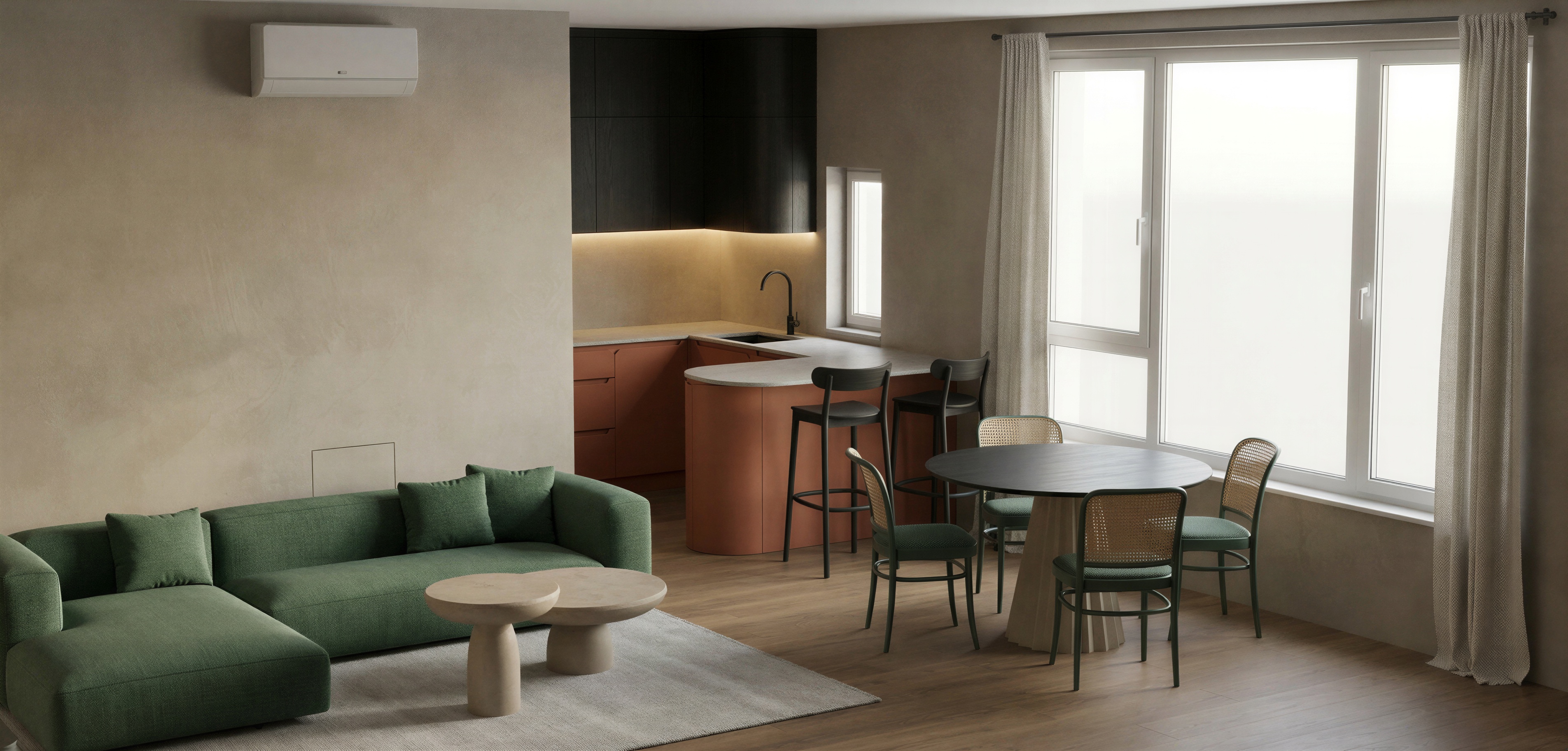 change the texture of the couch to a bold fabric texture in a different shade of green add pillows and a blanket to the couch place a dish towel on the kitchen counter by the sink add an open magazine to the dining table add an abstract painting with muted colors to the wall behind the couch