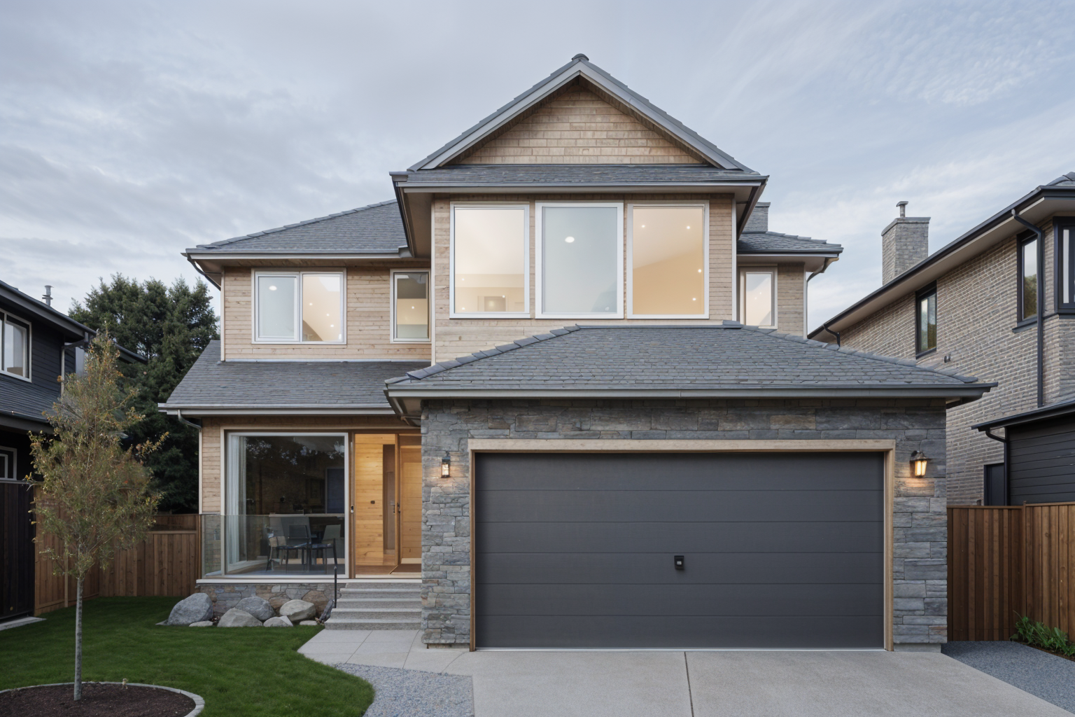 modernist interior shot west coast modern home in north vancouver cedar siding mixed with dark hardie board panels large windows with black aluminum frames flat roof led soffit lighting minimalist landscaping with stone pathway architecture