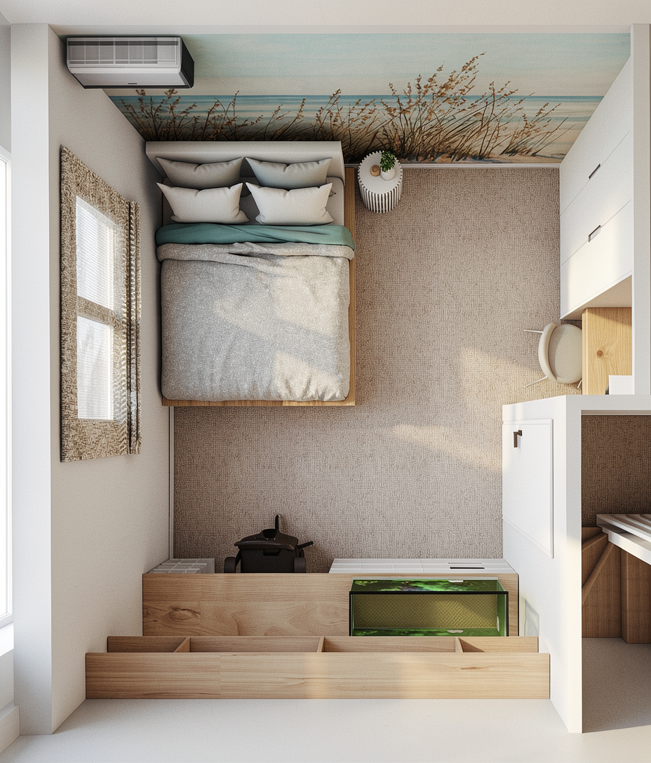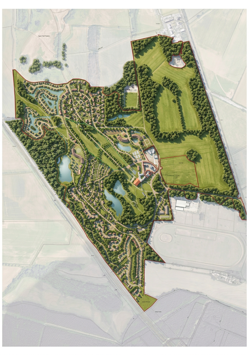 create a detailed landscape rendering of a property map with rolling green fields dense green forests winding pathways and serene reflective blue ponds highlight the borders with a crisp red line for clarity capture the essence of a warm sunny day with soft natural lighting to enhance the vibrant green hues and the gentle blues add subtle textures to the fields and trees for a lush appearance and use a light neutral backdrop to enhance the focus on the property details ensure a sense of peace and tranquility throughout the scene