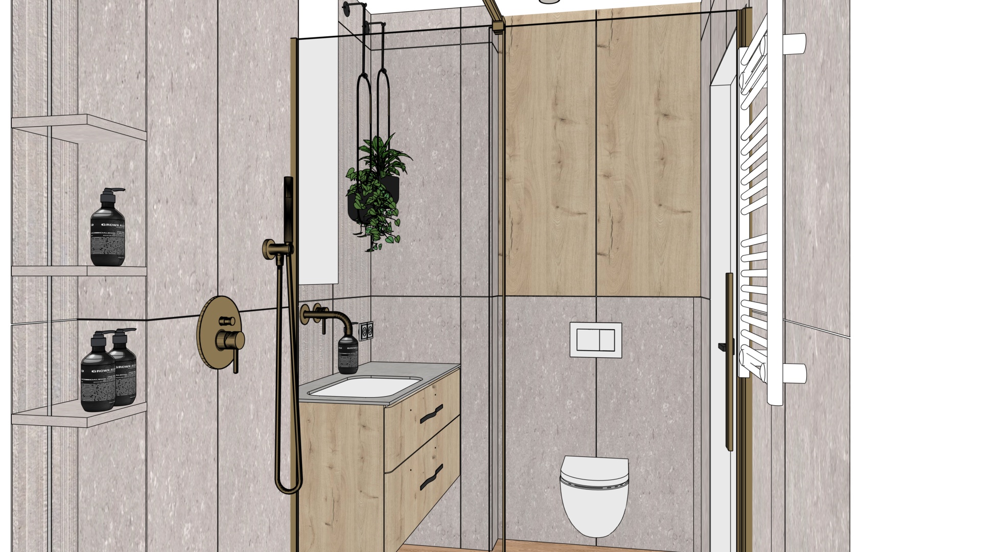 create a modern bathroom choose darker wood floors and light colored cabinets with visible grain brushed nickel fixtures and a luxurious glass shower enclosure use a soft gray on the walls to create a calming atmosphere highlighting the texture of the tiles add two minimalist black ceiling lights introduce hanging plants in black pots to add a touch of greenery create a bright and airy atmosphere with soft natural lighting add led lighting around the mirror add floor to ceiling led lighting in the shower alcove with four shelves reflect the smooth frameless white door in the mirror add a towel rack by the vanity unit highlight the texture of the tiles behind the mirror and in the shower alcove black handles in the cabinet nie wstawiaj adnego okna