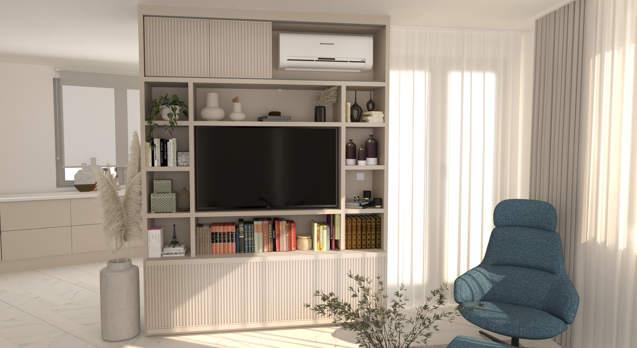 make a photorealistic image maintain colors maintian color blue of armchair do not add anything to the image wardrobe color angora beige egger