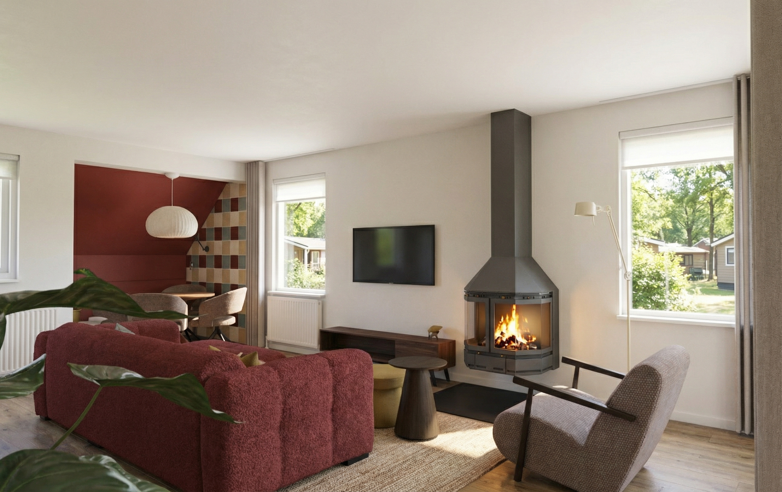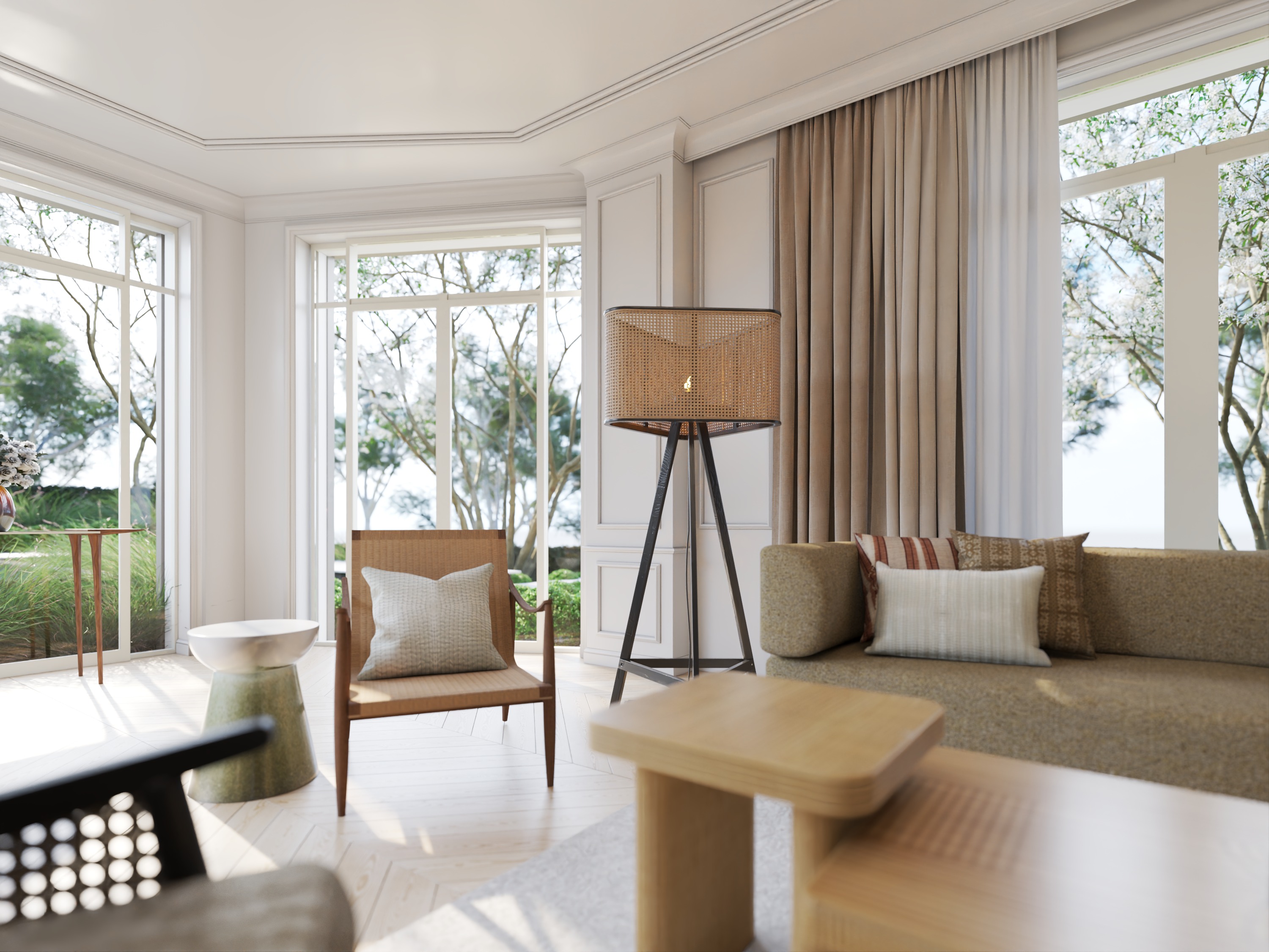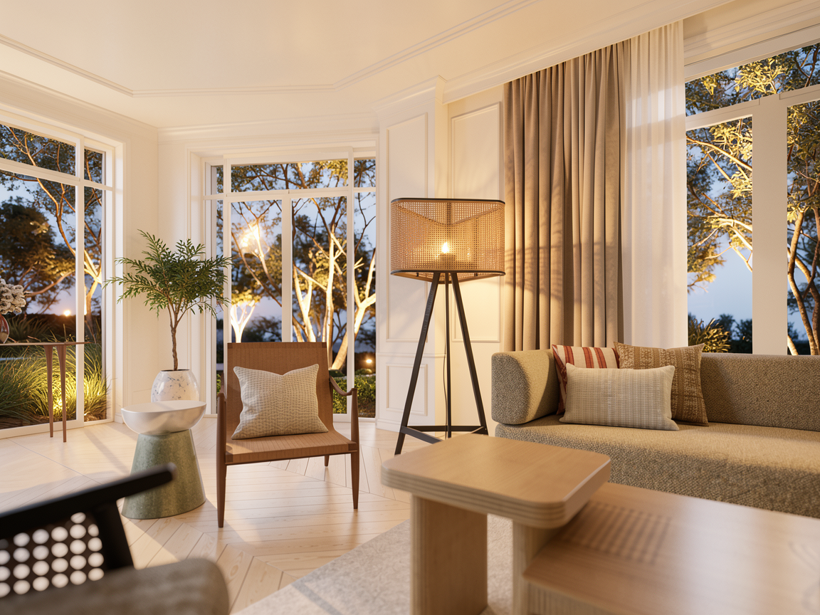 enhance the realistic texture and soft evening lighting maintain the elements material and angle of the picture maintain the shape of outdoor vegetation set indirect artificial lighting to enlighten every trees outside the room make the outdoor garden look stunning with warm lighting set the outdoor lighting to enlighten every vegetation the interior is dramatic and soft warm white