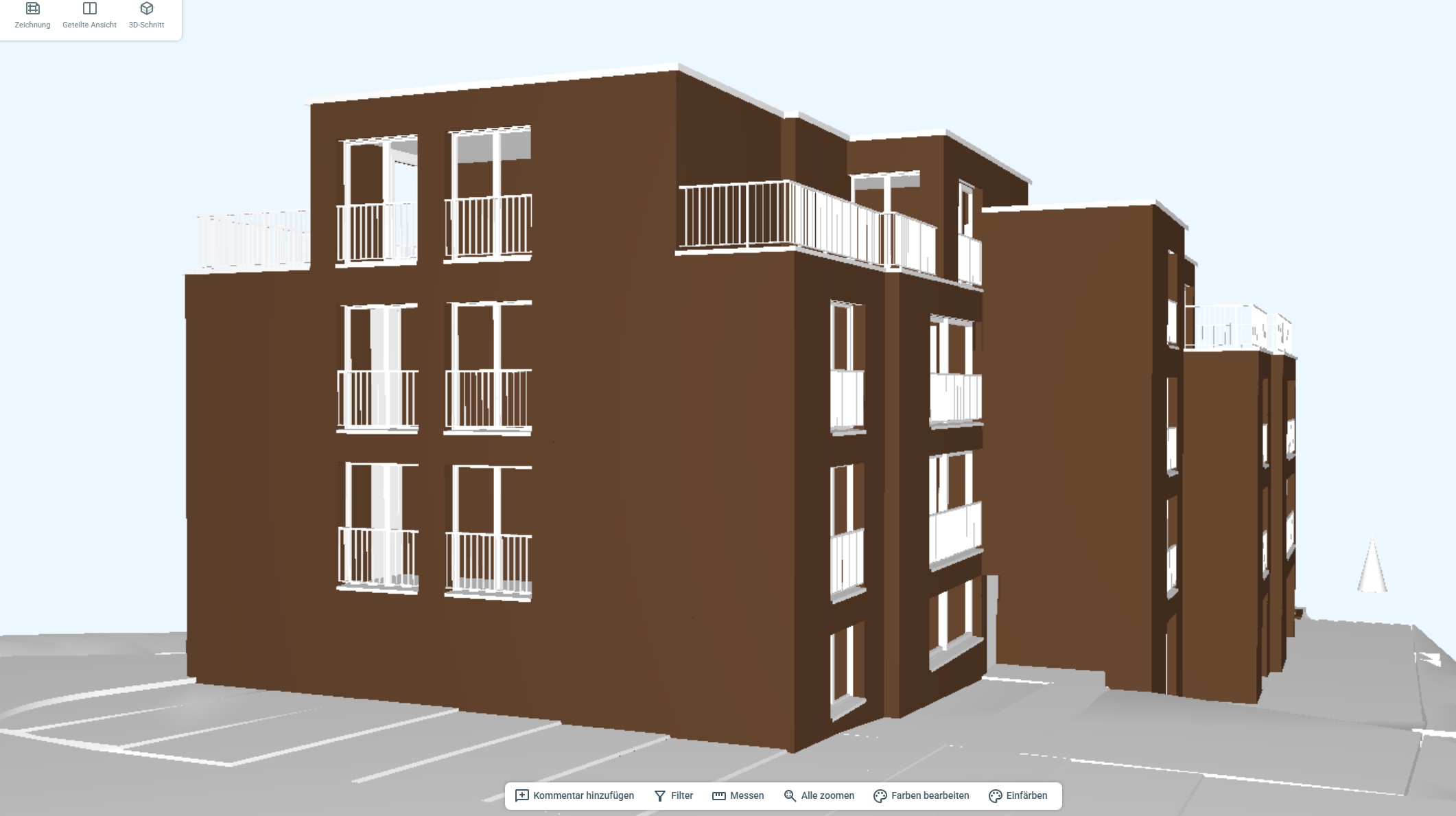 genau dieses rendering berarbeiten fotorealistisches foto exakt dieselbe perspektive und kameraposition wie das hochgeladene referenzbild 100 identische geometrie exakt gleiche anordnung exakt identische fensterpositionen mit gleichem ausblick durch die fenster weiches nat rliches tageslicht leicht schr g einfallende sonne durch die fenster r ume hinter den fenstern k nstlich ausleuchten sanfte realistische schatten realistische materialien echte texturen hochwertige oberfl chenreflexionen echte menschen echte autos pflanzen mit echten b umen und str uchern ersetzen hellgraue klinkerfassade gr ne fl chen mit wiese rasen und einigen b schen ersetzen sehr realistische umgebung im vordergrund oben ist die strasse in der flucht zum haus rechts am haus entlang ist natur mit wiese und b umen bis nach unten links ein grosser baum links am haus entlang geht eine schmale strasse runter zum eingang am haus entlang parkpl tze b sche direkt am haus oben nat rlicher himmel mit leichter bew lkung im hintergrund der z richsee 40 meter weiter unten und 200 meter entfernt belebte szene mit menschen canon eos r5 35 mm festbrennweite f 2 8 nat rliche farbwiedergabe leicht warme farbstimmung golden hour feeling hyperrealistisch dslr qualit t raw aufnahme 8k aufl sung extrem scharf perfekte tiefensch rfe professionelle architekturfotografie architectural photography of a skyscraper perspective correction perfectly straight vertical lines shot with a tilt shift lens