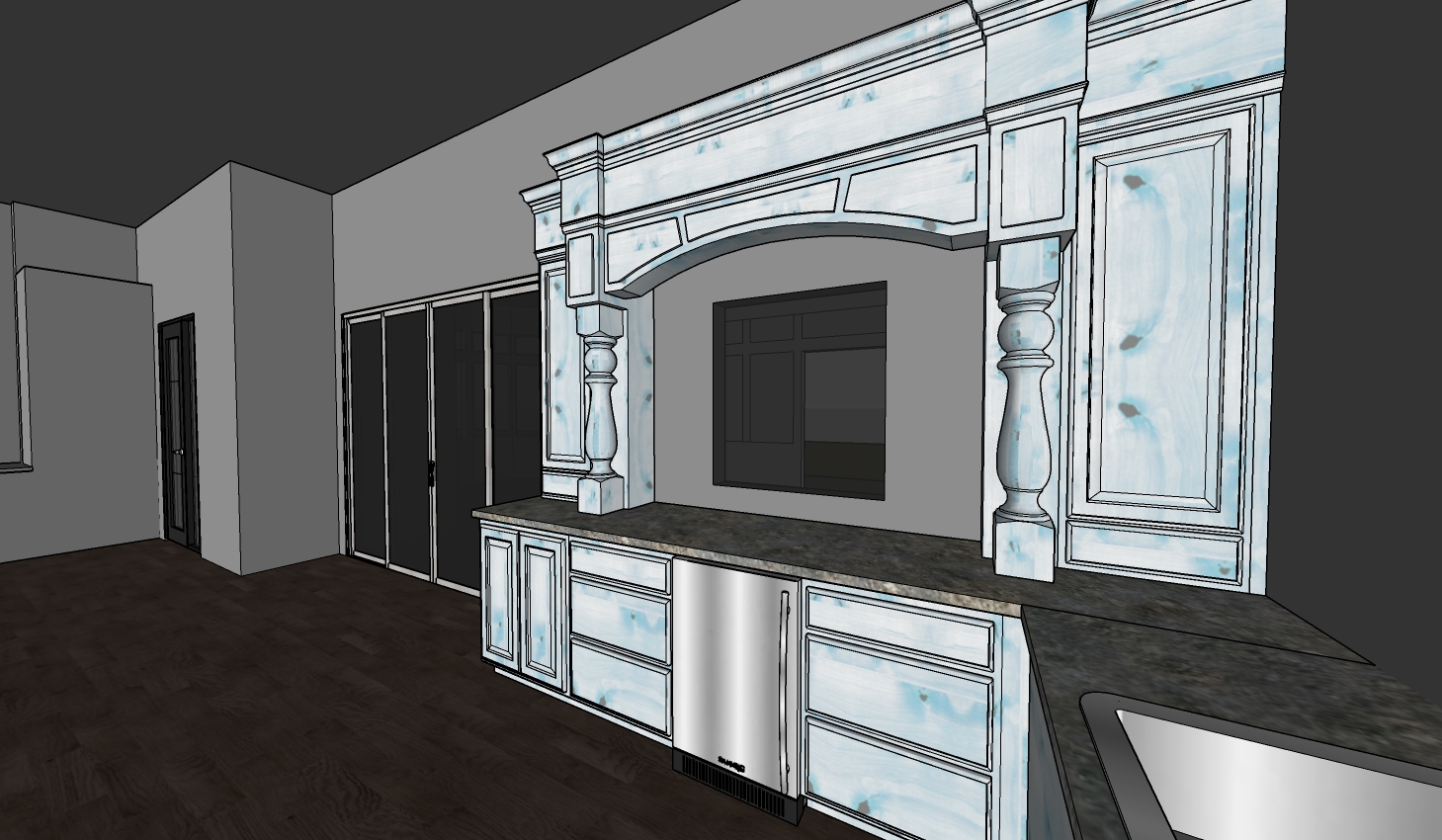 render a realistic looking coffee bar the cabinetry should be a light blue color there should be a victorian style arch in teh cabinetry over a pass though window the cabiebts should have bronze hardware and soft underlighting the full height cabinet to the left should match the color of the coffee bar the sliding glass door and the wood pantry door should have white white victorian style casing