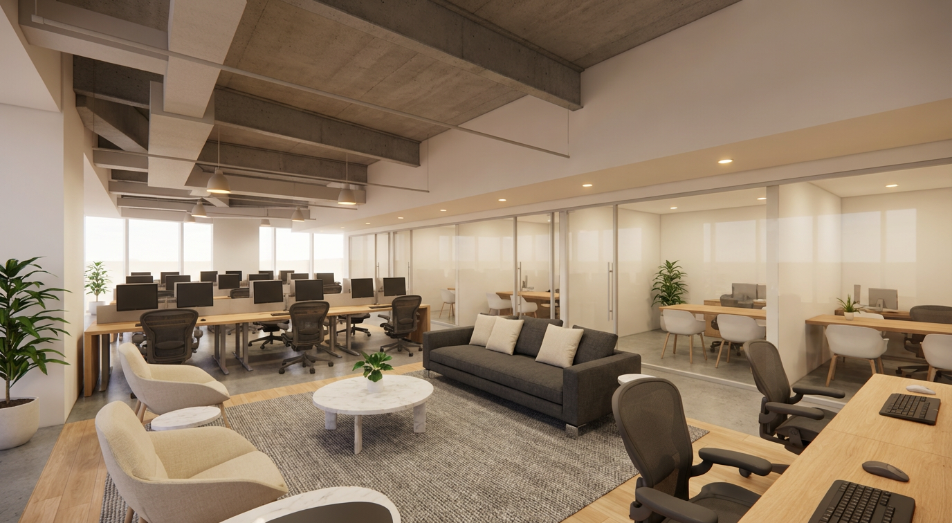 transform the provided interior image into a high end photorealistic render while keeping everything exactly the same same proportions same seating same ceiling and same spatial configuration do not move or alter any objects geometry people and furniture positions all objects throughout must remain exactly in the same locations lighting should come from above feature interior lighting with gentle reflections soft shadows and luxurious catalog level realism provide midtown nyc views from 46 floor at the back windows include six people professionally dressed