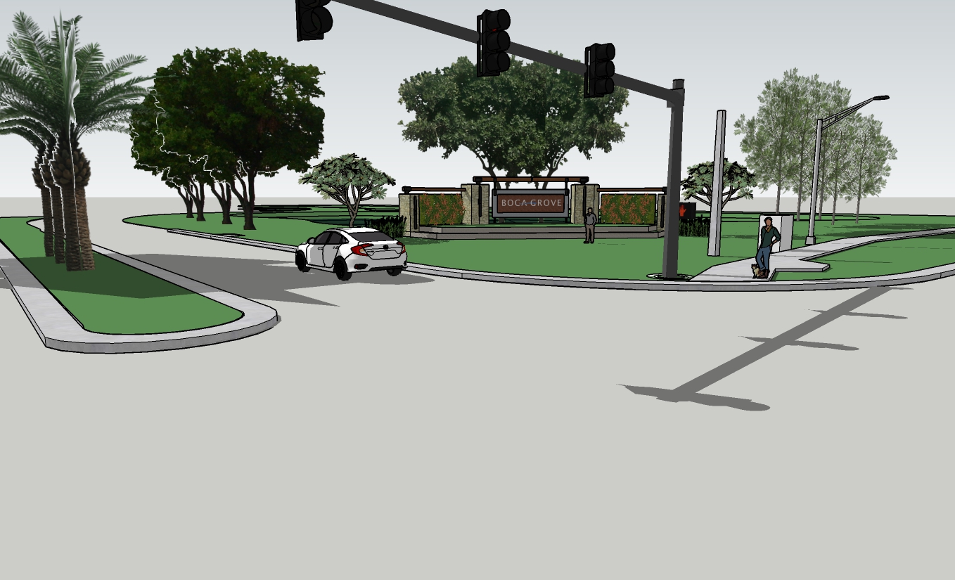 add landscape background sky keep sign fount the same add some low bushes to grass areas