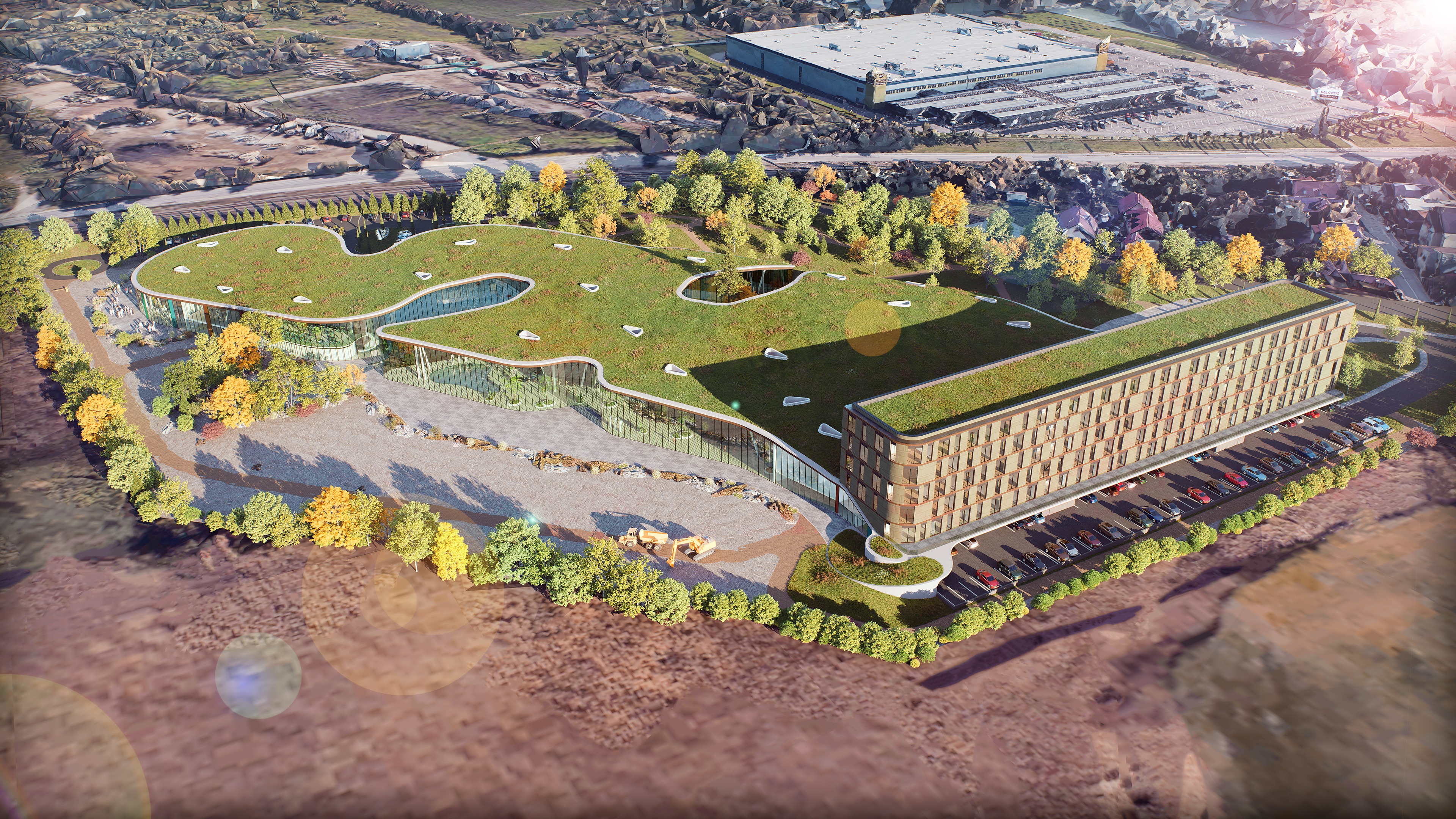 mportant preserve the existing geometry and the existing context exactly as provided preserve the existing windows do not add new windows do not modify alter reinterpret add remove scale or reshape any geometry do not change the site surroundings street layout neighboring buildings vegetation or context elements do not modify geometry scale proportions buildings road layout sidewalks or surrounding context in any way do not modify text soft sunny noon atmosphere diffused neutral natural daylight with subtle tones cinematic architectural mood large glass surfaces with realistic reflections soft mirror effect environmental reflections of sky and surroundings important do not add new windows